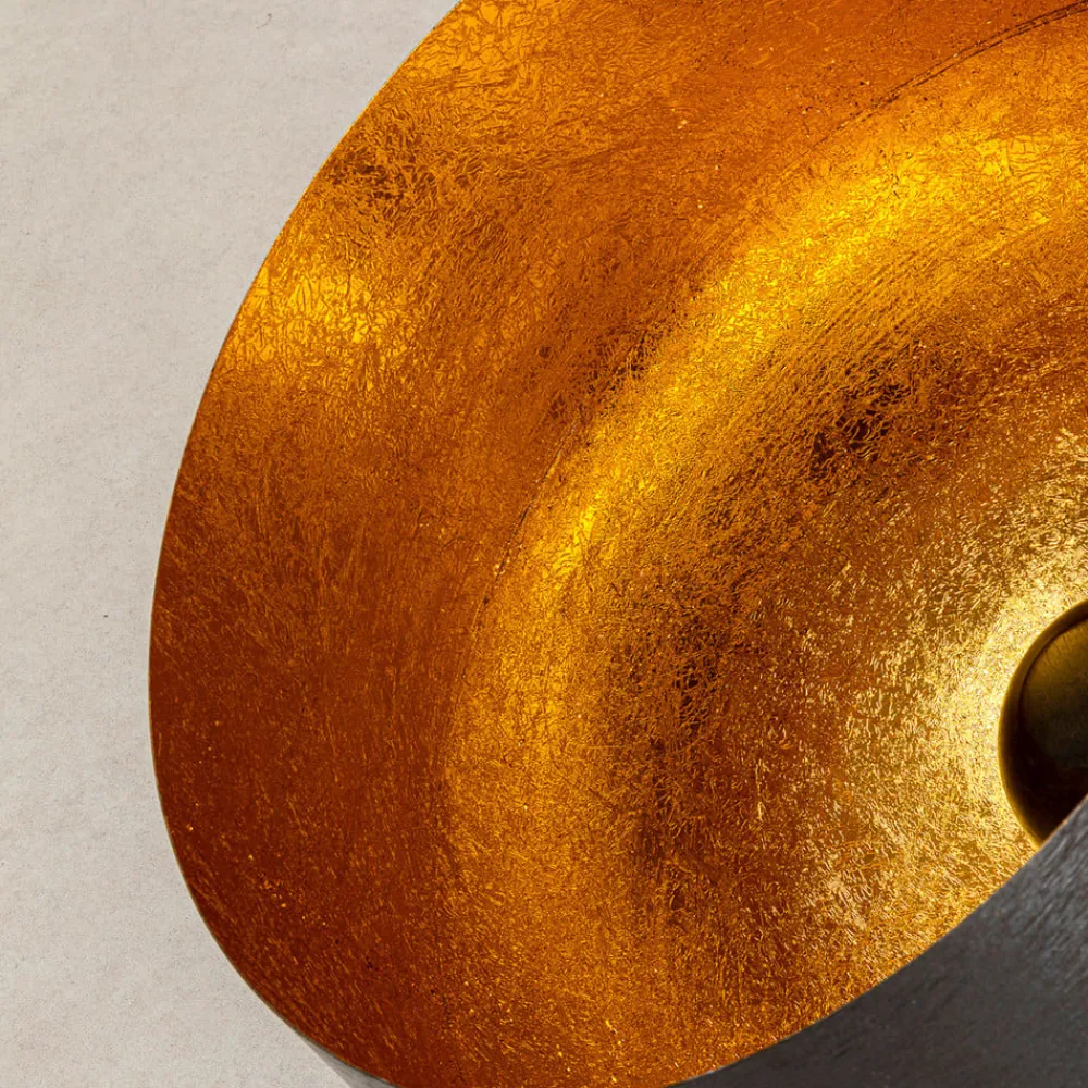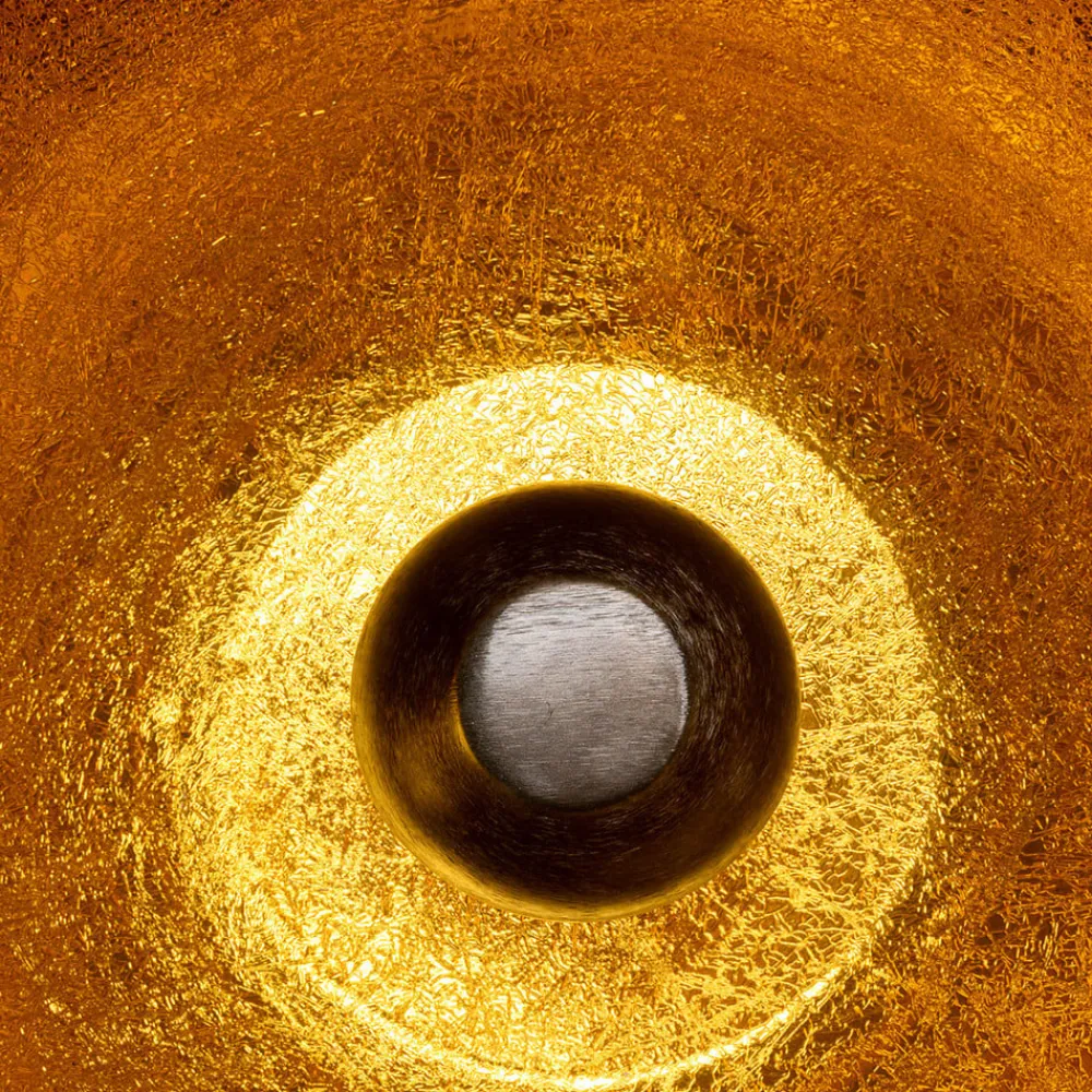 Gulvlampe Apollon i stål med gyllen innsideApollon er en gulvlampe i stål som er formet som en dyp skål. Lyskilden sitter dypt inne og utstråler en veldig koselig atmosfære med et varmt lys på grunn av den gylne innsiden av skjermen. Foran lyskilden er det en liten skjerm som hindrer direkte lysstråling og reflekterer lyset fra lyskilden tilbake i skålen. Plassert på gulvet eller på en skjenk er lampen ikke bare en vakker lyskilde, men også et eksklusivt dekorativt objekt. Den er utstyrt med en 200 cm lang, tekstilbelagt kabel.