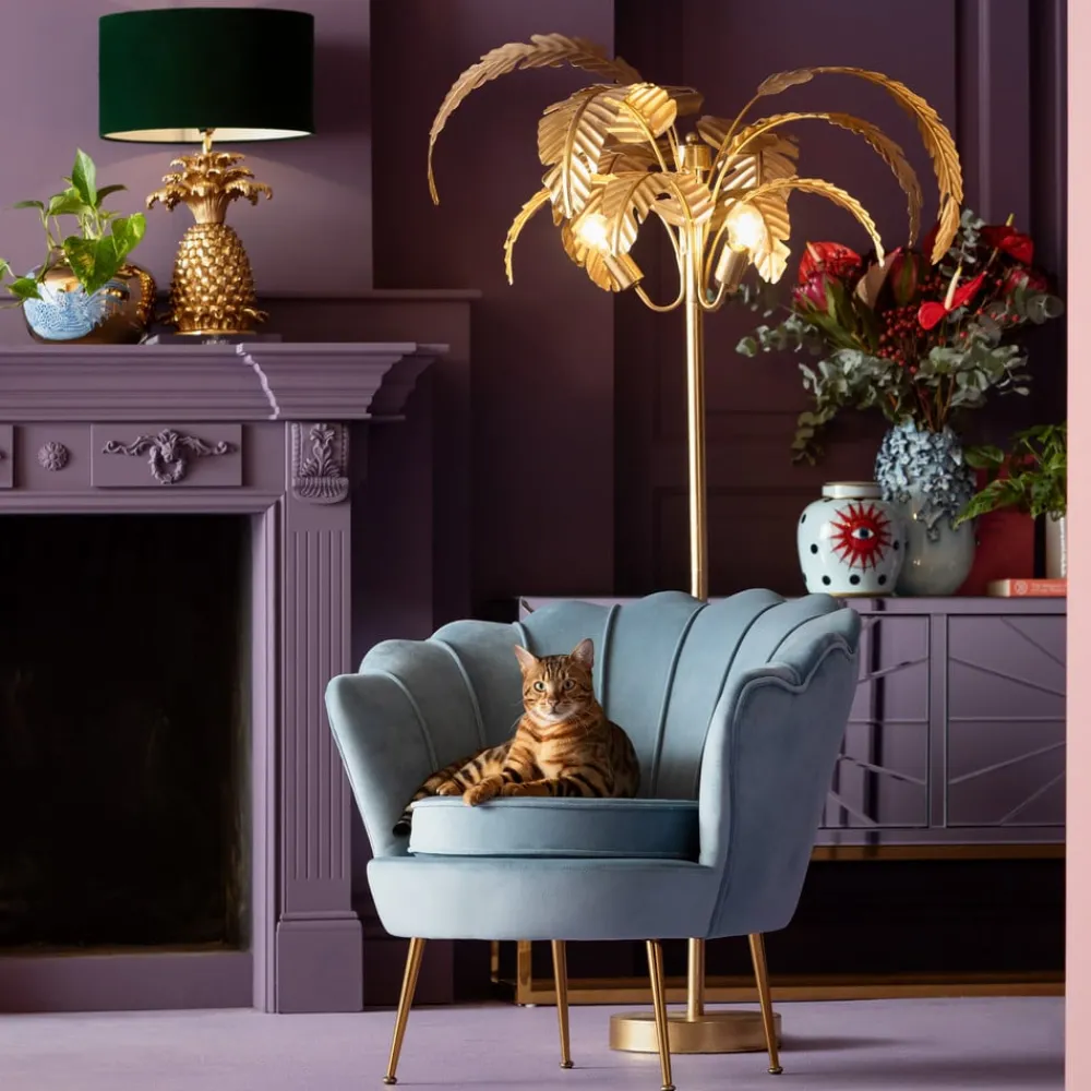 Palmera gulvlampen, som er like høy som en mann, skaper en feriefølelse. Lampen er laget av messingfarget stål og lampeskjermen er utformet i form av flere palmeblader. Den ekstraordinære designen kombinerer den glamorøse stilen fra 1920-tallet med en del tropisk stil og skaper en WOW-effekt i hver stue. Hvis Palmera er utstyrt med lyskilder etter eget valg, gir den behagelig og atmosfærisk belysning, som sørger for en tiltalende atmosfære.