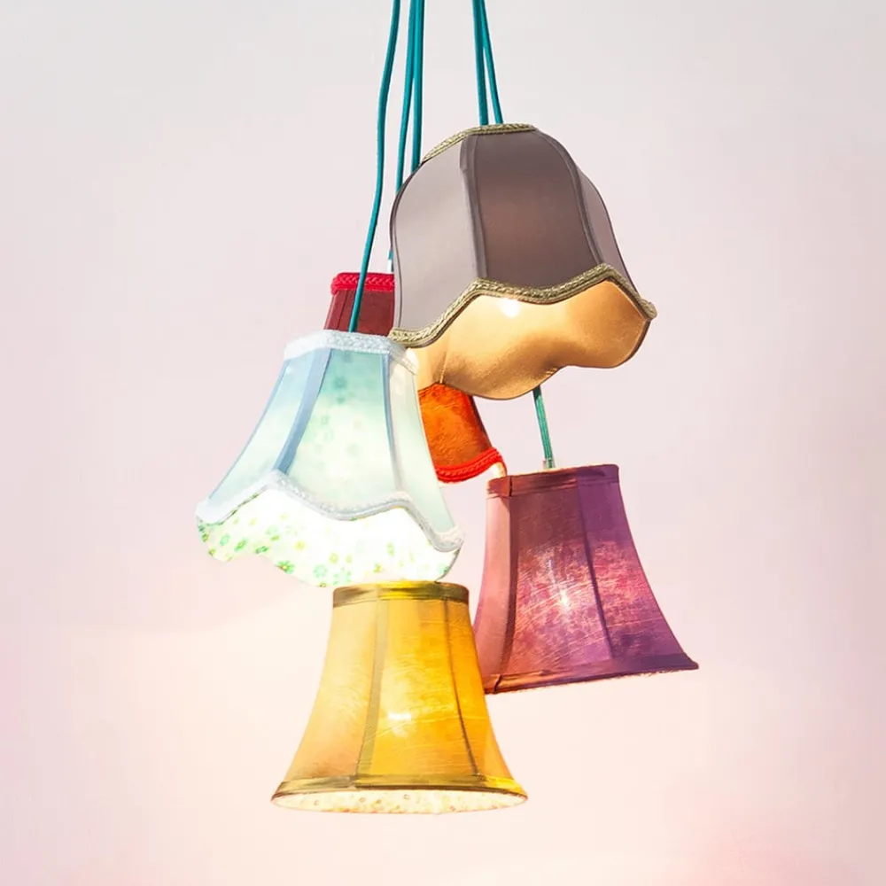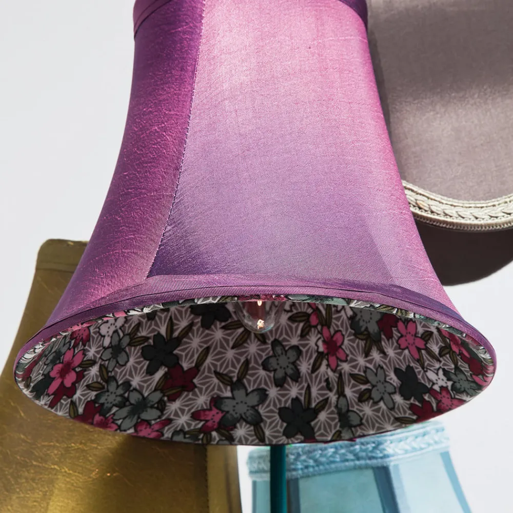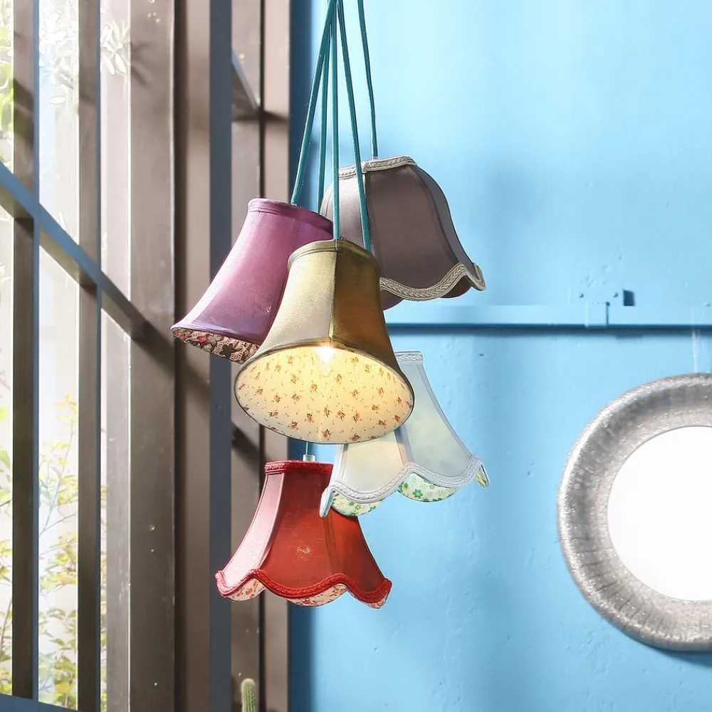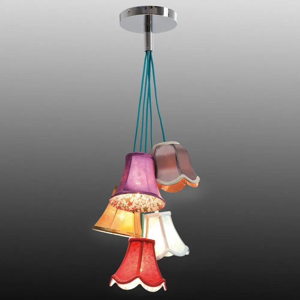 Klassiske elementer i et moderne uttrykk – hengelampen Saloon Flowers 5 er et slående designobjekt Gulvlampeskjermer i taket? Ikke noe problem med Saloon Flowers 5! Pendellampen har 5 klassiske lampeskjermer (sølvgrå, lilla, oker, turkis og rød) på blå tekstilkabler, som til sammen skaper et fargerikt, moderne kunstverk. Som en fargerik blomsterbukett utstråler lampen hygge og varme til enhver tid og bringer våren inn i hjemmet uansett vær. Hver av skjermene er unike, og de kan være forskjellige fra dem som vises på bildene.