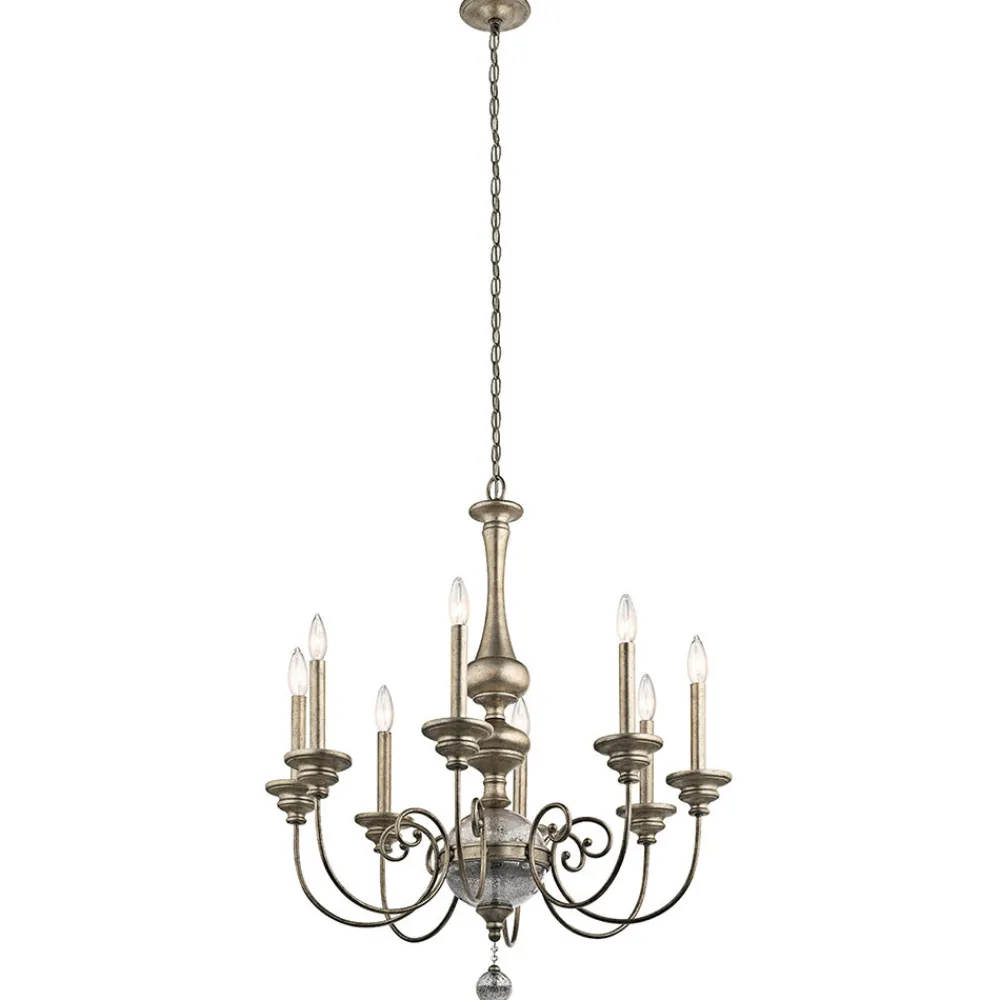 Den åtte-flamme lysekrone Rosalie virker lys og nesten filigran på grunn av den feiende designen i Williamsburg-designet. Fargetone på finishen er kjent som sterlinggull, da den inkluderer sølv- og gulltoner. Det gir lysekrone Rosalie et veldig festlig utseende. De to dekorative elementene har også en veldig estetisk effekt: et glasselement laget av antikk Mercury-glass sitter i midten, og et dekorativt anheng laget av det samme glasset henger fra toppen av lysekronen.