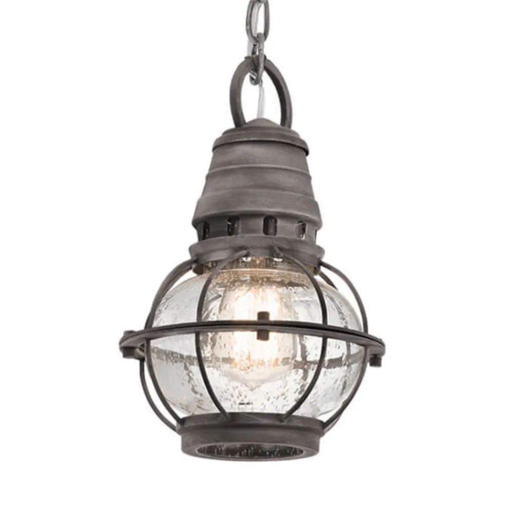 Designet til denne vakre, utendørs pendellampen Bridge Point med rundt lampeglass er inspirert av tradisjonelle skipslamper og jernbanelamper.