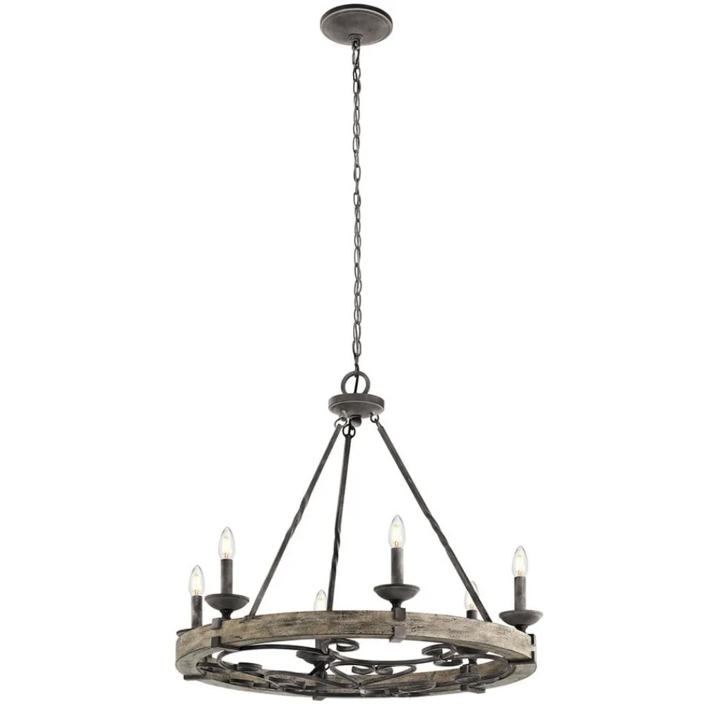 Denne rustikke lysekronen Taulbee gir ikke bare rikelig med lys, men også historisk preg. Lysekronen passer både til kjøkkenet og til soverommet, stuen eller gangen. Trekransen med grålig pigmentering skaper en middelaldersk atmosfære.