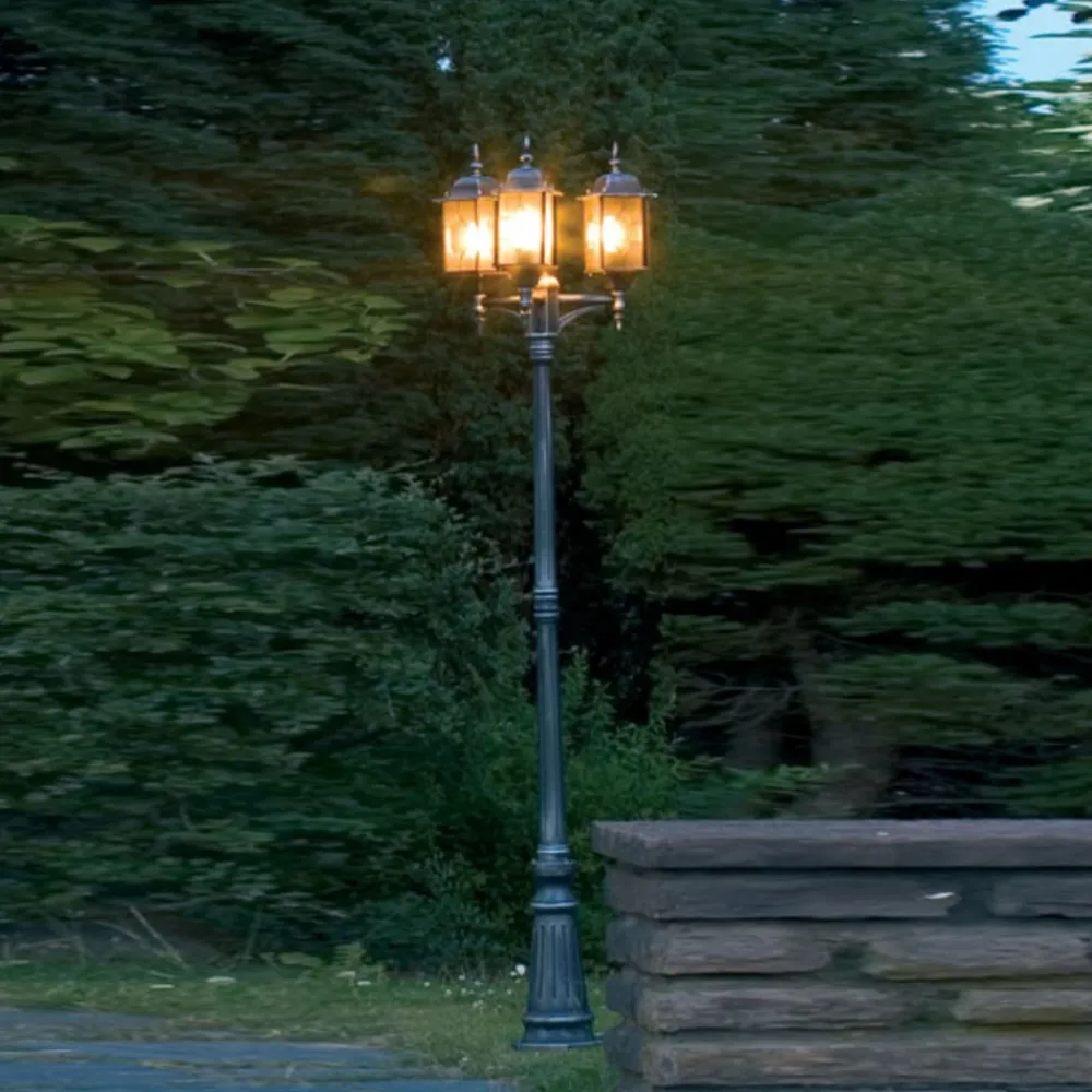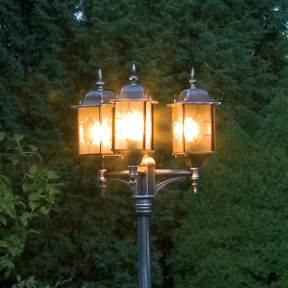 Denne lyktestolpen av aluminium har et svært edelt utseende med sine tre lanterner, akrylglassene i blykrystalloptikk og ornamentene på armene. Lanternene er ordnet i en trekant og sikrer dermed en god belysning.
