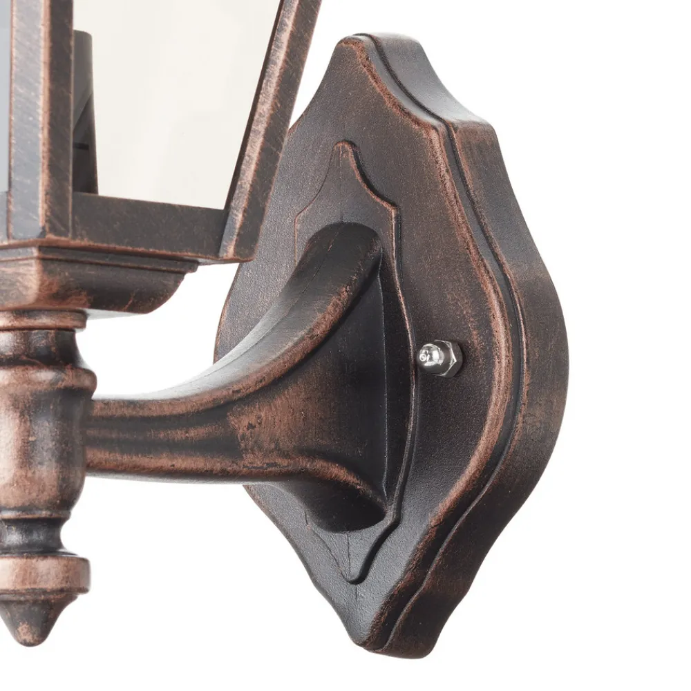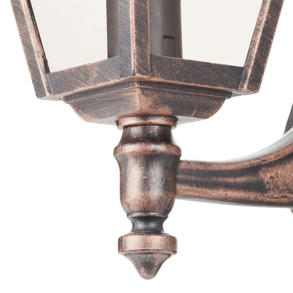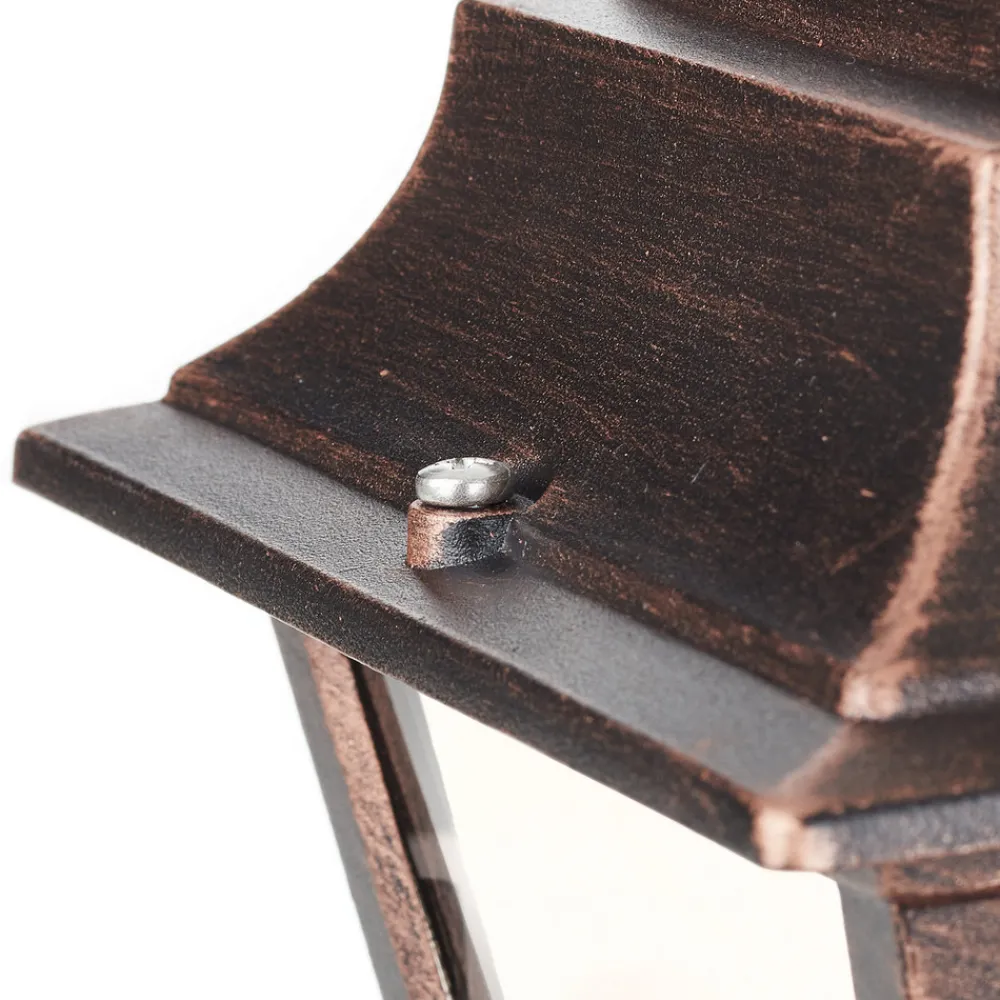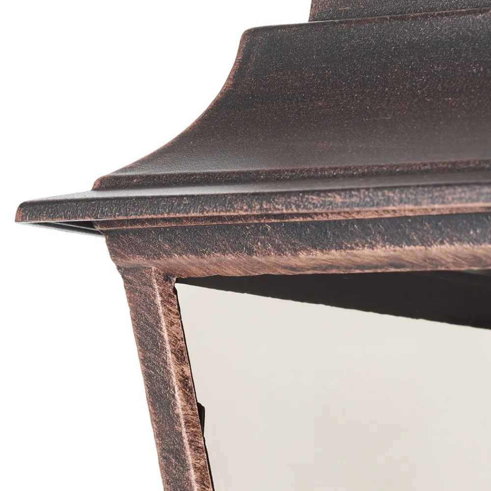 Kobberlooken gir Toulouse utendørs vegglampe en klassisk sjarm Toulouse utendørs vegglampe ser ut til å være inspirert av tidligere tiders stil og gir utendørsarealer en helt spesiell atmosfære. Den strukturerte rammen av pulverlakkert aluminium i antikk kobberlook gjør også lampen til et attraktivt blikkfang. Med kapslingsgrad IP43 er Toulouse optimalt beskyttet mot inntrengning av fremmedlegemer fra 2,5 mm og vannsprut. Denne utendørs vegglampen er også kompatibel med sparepærer, noe som gjør den enda mer attraktiv.