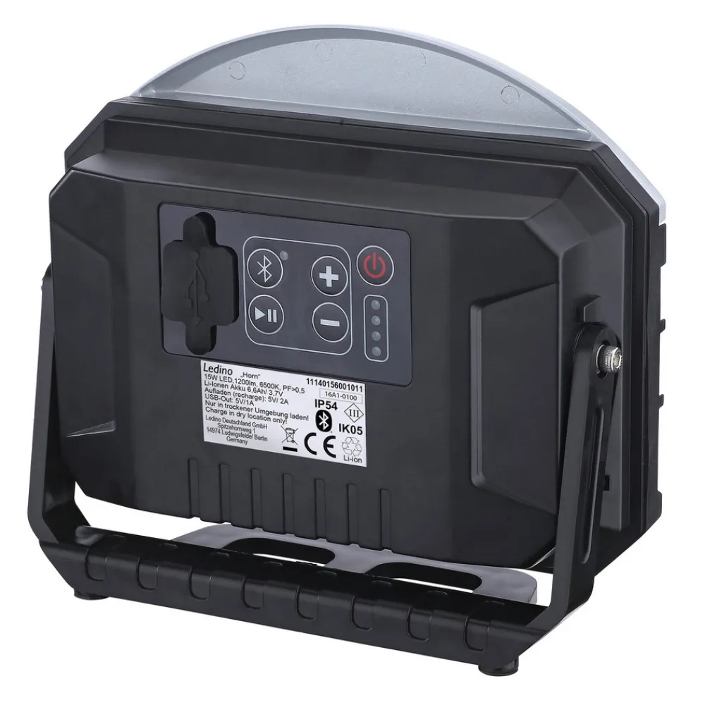 Oppladbar Horn LED-spotlight med praktisk Bluetooth-høyttaler Den oppladbare Horn LED-spotlighten er ikke bare en energieffektiv lyskilde, den overbeviser også med en rekke funksjoner. Fremfor alt gir lyskasteren tilstrekkelig lys og lysstyrke når du arbeider, for eksempel i garasjen eller på byggeplassen. De to Bluetooth-høyttalerne kan enkelt kobles til for eksempel din egen smarttelefon. Dermed kan du for eksempel høre på musikk mens du arbeider. Lysstyrken på LED-lampene kan dimmes i tre trinn. Takket være kapslingsklasse IP54 er arbeidslampen beskyttet mot vannsprut og støv. Av/på-bryter og indikator for ladenivå er integrert – inkl. lader (5V 2A) & USB-ladekabel – USB-utgang (5V 1A) – Bluetooth-høyttaler 2x 3W