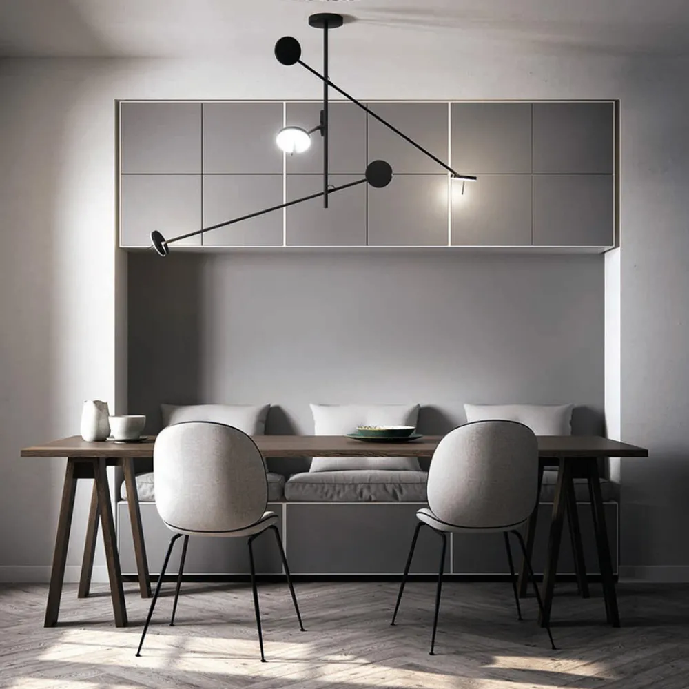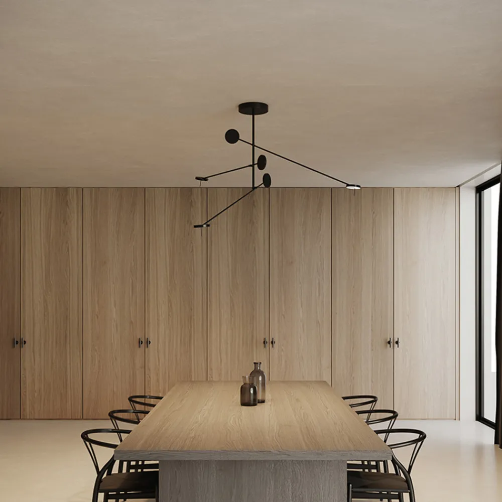 Som en mobil imponerer pendellampen, som er utstyrt med tre lampehoder, med sin rene minimalisme og geometri. Sist men ikke minst spiller dette inntrykket inn gjennom motvektene i den andre enden av leddet. Lysstyrken på LED-ene installert i de runde lysene kan varieres ved hjelp av en fasesnittdimmer (ikke inkludert). På grunn av de mange leddene på lampehodene og stengene er Invisible spesielt fleksibel og kan tilpasses individuelle forhold. Den hengende lampen kan lyse opp rommet med indirekte lys samt selektiv belysning, for eksempel for å gjøre lesingen ved spisebordet mer behagelig.