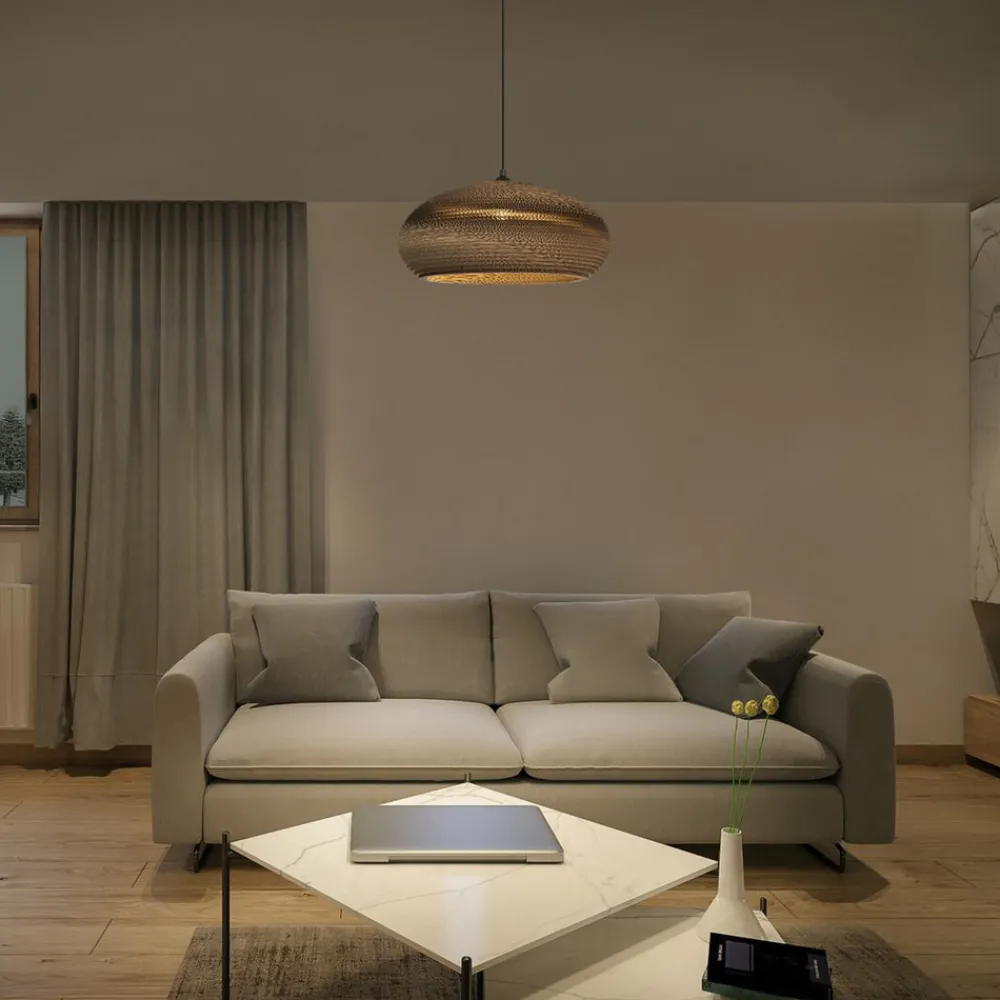 Drop hengelampe med brun skjerm i bølgepapp Drop er en dekorativ armatur med en elliptisk skjerm i brun bølgepapp, utstyrt med fatning E27 og tekstilmantlet kabel. Den er en av mange armaturer i Decor Cardboard-serien fra LEDVANCE. Med sin unike struktur skaper skjermmaterialet en varm og naturlig atmosfære og en effektiv lyseffekt i ethvert rom. Materialet er lett, lett resirkulerbart og iøynefallende. Flere av armaturene i serien ser svært dekorative ut i et rom.