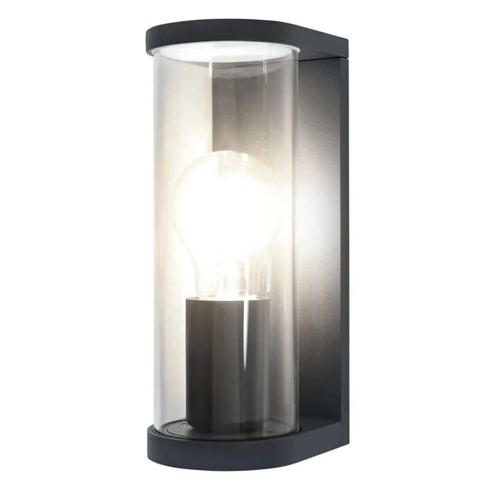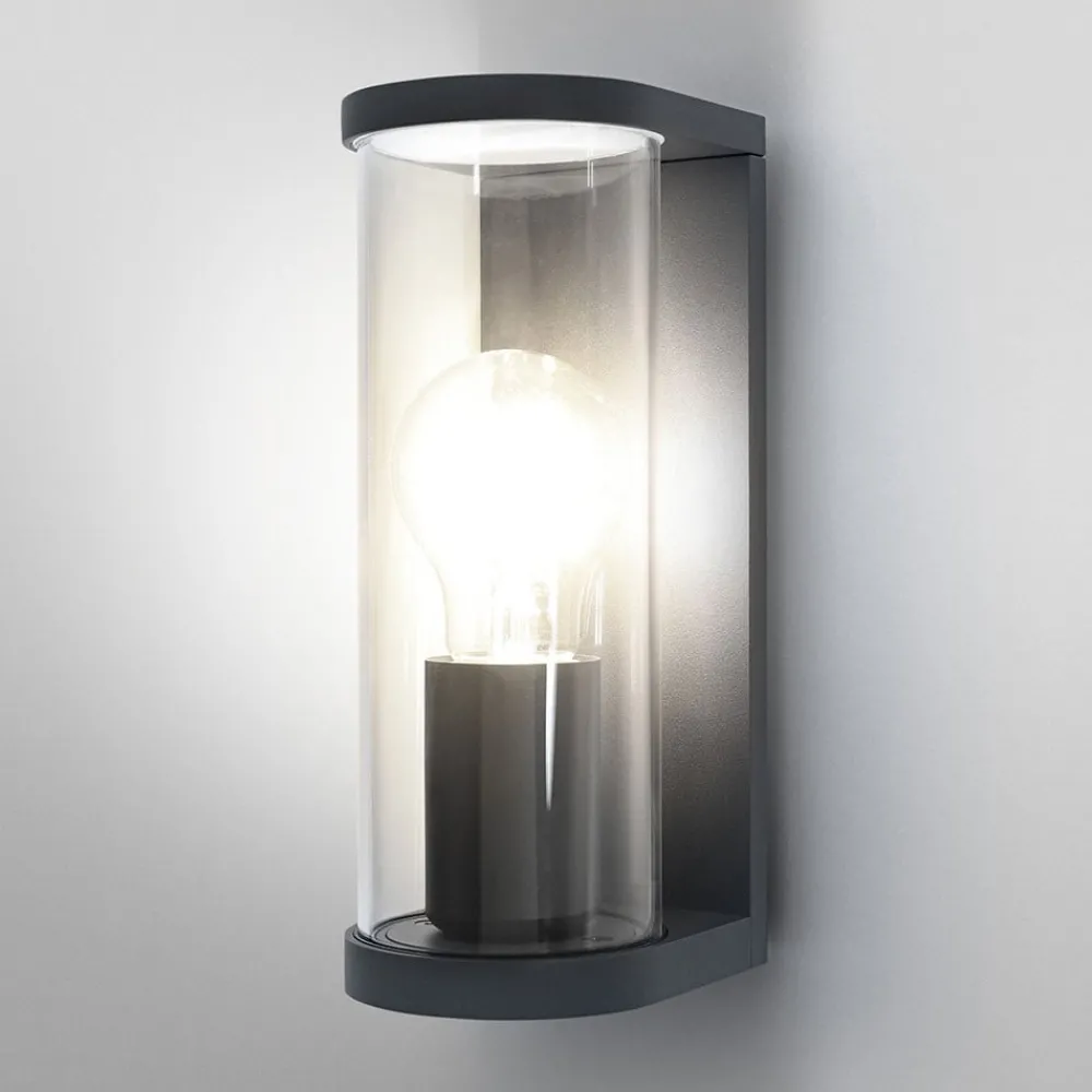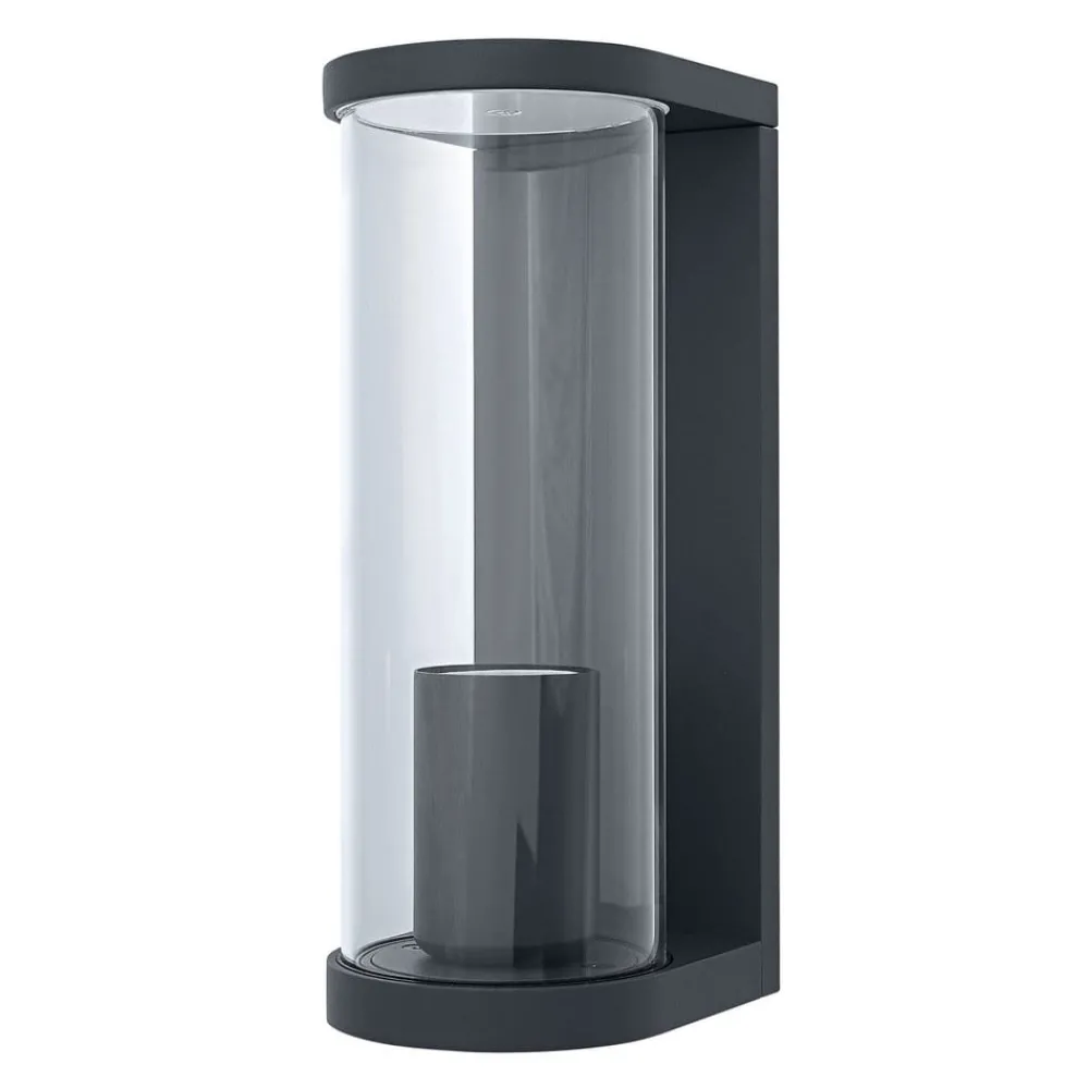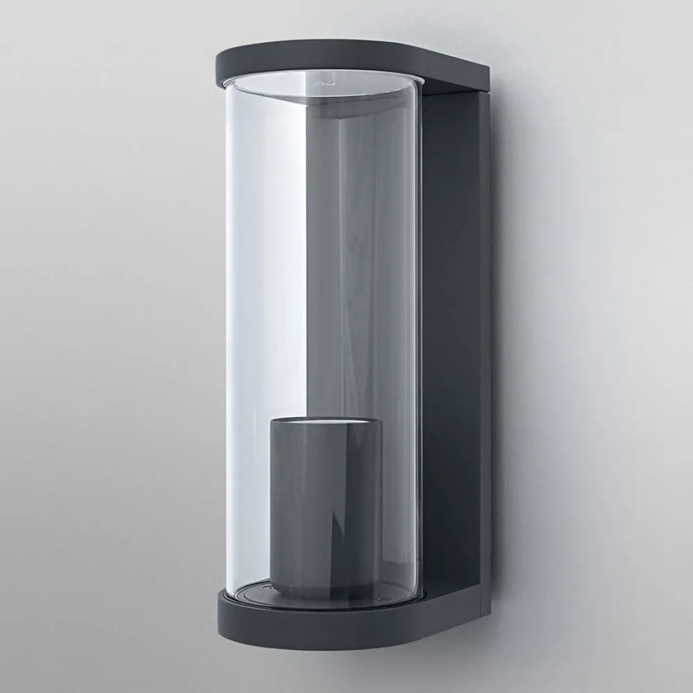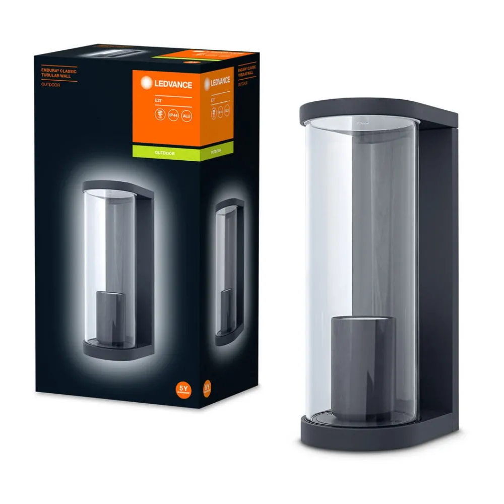 Mørkegrå Endura Classic Tubular utendørs vegglampe med klar glassylinder Endura Classic Tubular er en utendørs vegglampe med tidløs design som passer til alle fasader. Armaturen består av et mørkegrått veggbrakett i aluminium med utstikkende kurver i topp og bunn som holder den transparente glassylinderen på innsiden. En E27-sokkel er plassert i midten av glassylinderen slik at lyskilden er omgitt av glassylinderen. Sammen med en glødelampe (medfølger ikke) gir lampen et flott uttrykk. Lyset skinner gjennom den gjennomsiktige glassylinderen ikke bare rundt, men også oppover.