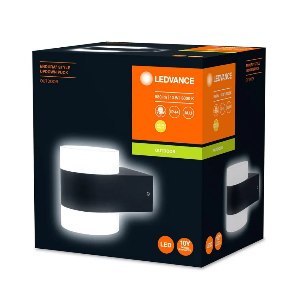 Endura Style UpDown Puck utendørs vegglampe består av et mørkegrått aluminiumhus, glasslisten på toppen og bunnen ligner formen på en puck. Det enkle fargevalget og det iøynefallende designet fungerer spesielt dekorativt ute i huset.