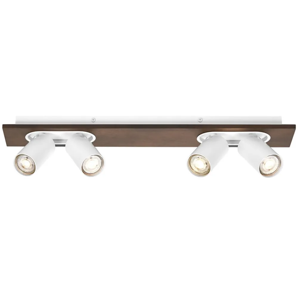 Mercury LED-takspotlight, fireflammet med GU10 LED-lyskilder Mercury fireflammet LED-takspotlight fanger blikket med sin vakre kombinasjon av materialer og farger og enkle design. Den lange, rektangulære baldakinen, som i likhet med de fire spottene er laget av lakkert stål, har et litt større dekorativt panel av mørkt tre. På dette sitter spotlightene som et par i stålovaler. Justeringsmulighetene for hver enkelt spotlight gjør det mulig å målrette belysningen av ulike områder i rommet. Dimbare GU10 LED-lyskilder er inkludert og kan skiftes ut – Komplett monterings- og tilkoblingstilbehør medfølger