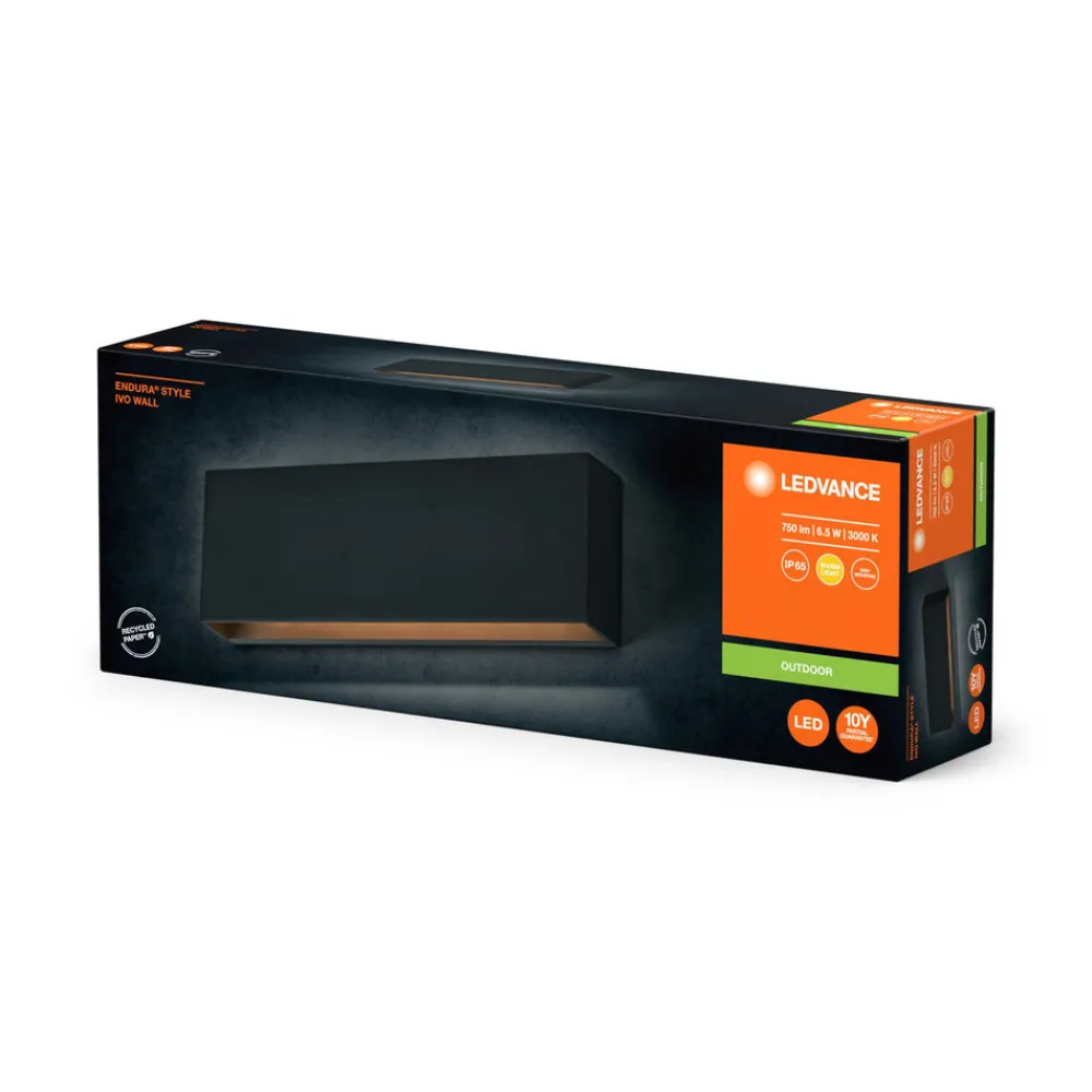 LEDVANCE Endura Style Ivo: eleganse møter effektivitet for utendørsarealer LED-vegglampen Endura Style Ivo kombinerer elegant design i mørkegrå finish med høy funksjonalitet for utendørsarealer. Med kapslingsgrad IP65 er armaturen optimalt beskyttet mot støv og vannstråler, noe som gjør den til den ideelle belysningsløsningen for uteplasser og balkonger. Den integrerte LED-lyskilden gir ikke bare energieffektiv belysning, men også et moderne utseende som passer sømløst inn i moderne stiler. Opplev hvordan Endura Style Ivo endrer atmosfæren på uteplassen og skaper en behagelig stemning.