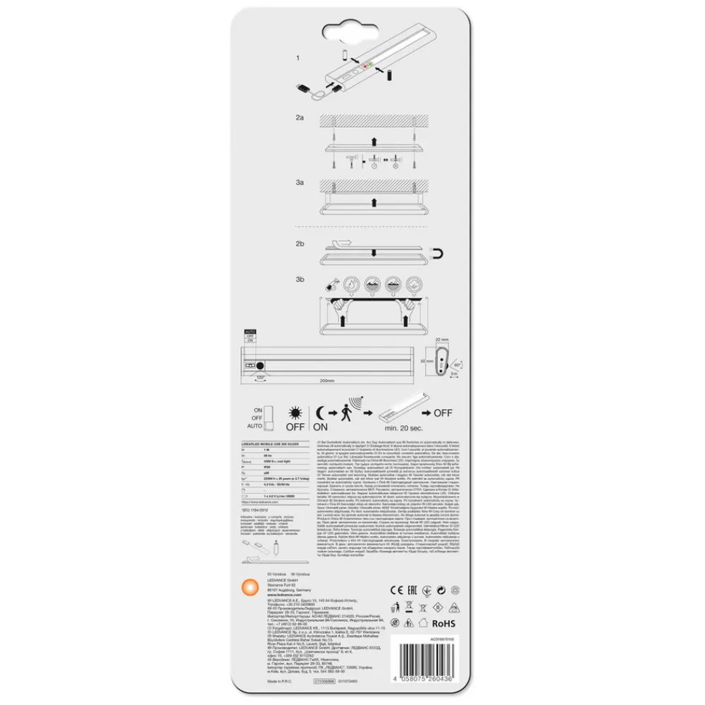 benkarmatur Linear Mobile USB er en allsidig ekstra lyskilde for møbelproduksjon i kjøkkenkrok, garderobeskap eller fremspring. Den lange kroppen av sølvgrå aluminium med polykarbonatdiffusor er valgfritt skrudd eller limt. Lampen kan tas ut av holderen for å lade batteriet (USB-kabel er inkludert).