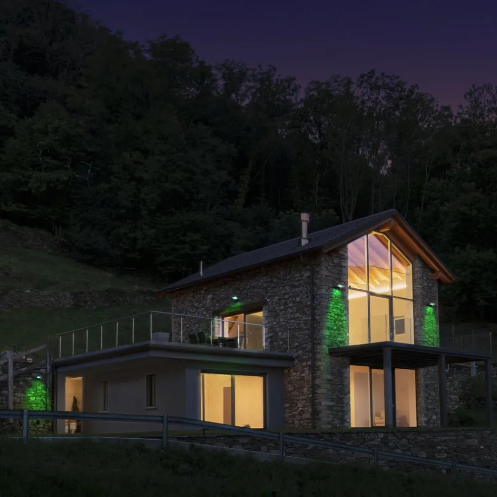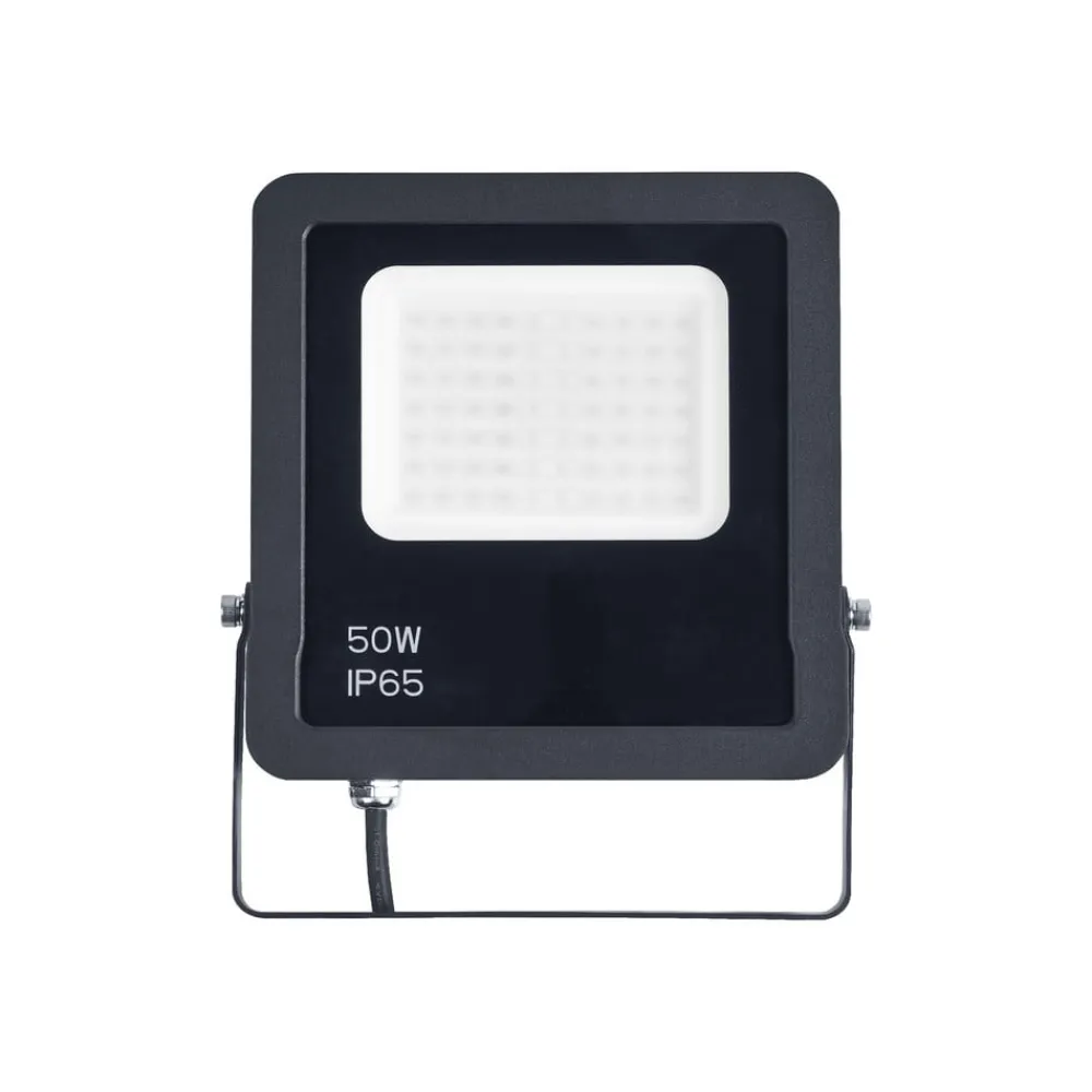 App-styring uten bridge/gateway: LED utendørs veggspotlight SMART WiFi Floodlight i svart, RGBW, dimbar, IP65 LED utendørs veggspotlight SMART WiFi Floodlight kan justeres fleksibelt takket være braketten og brukes som utendørs flomlys. Rammen er laget av aluminium og er både støvtett og beskyttet mot vannstråler. I tillegg til varmhvitt lys (3000 K) kan det stilles inn ca. 16 millioner fargede lysfarger. Lysintensiteten kan også dimmes trinnløst, og alt som kreves for å styre lyset, er en Wi-Fi-tilkobling og en smarttelefon eller et nettbrett (Android/IOS). Dette gjør det mulig å styre smartfunksjonene direkte uten bro/gateway. Stemmestyring er også mulig med Amazon Alexa og Google Assistant (krever et kompatibelt smarthussystem). SMART WiFi-lyskasteren leveres med en åpen kabelende (0,5 m), og nødvendig monteringsmateriell (skruer og plugger) er allerede inkludert i leveransen.