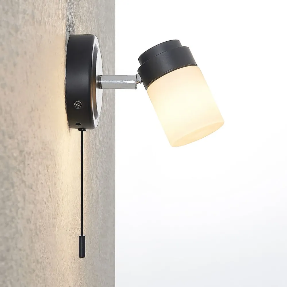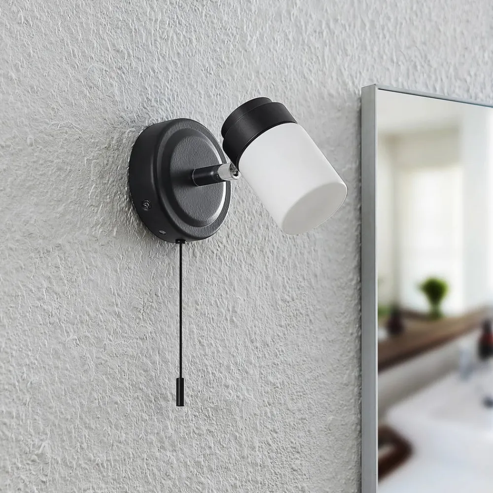 Alimari vegglampe med sylindrisk lampeskjerm og praktisk trekkbryter Med Alimari vegglampe kan du ikke bare forskjønne…