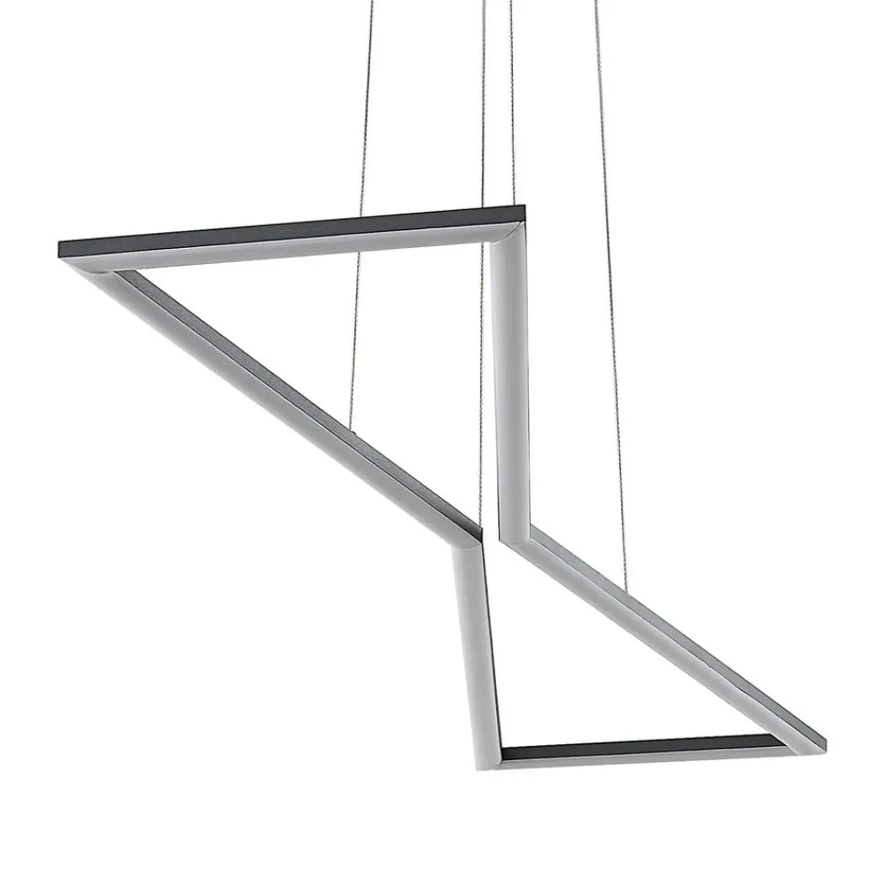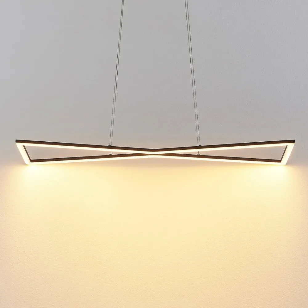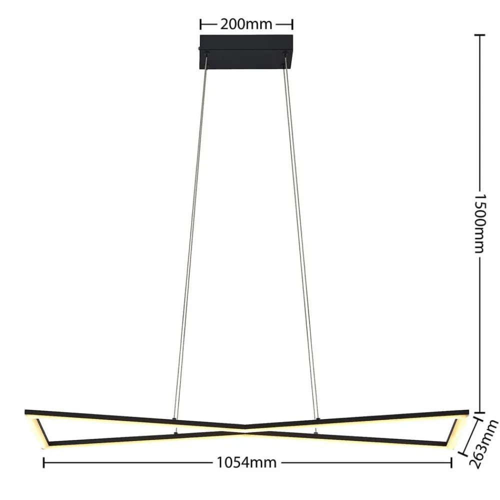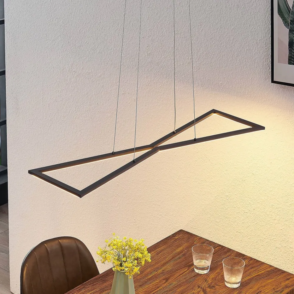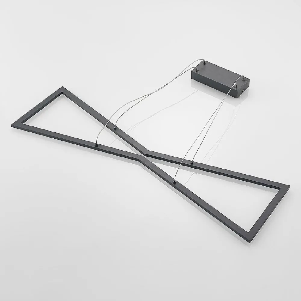 LED-hengelampen Arischa imponerer med sin moderne og symmetriske design. Dens kantete lampehus, som består av smale stag, som minner om et timeglass i form, sitter på en oppheng. Den er laget av stål, som også gir den et elegant og elegant utseende. Men det er ikke bare optiske egenskaper som taler for dem, men også deres praktiske funksjonelle egenskaper. En veggbryter gjør at lampen kan slås på og av som vanlig. Takket være 3-nivå dimmeteknologien med integrert av-funksjon, kan den også dempes til tre forskjellige lysstyrkenivåer ved å trykke på bryteren flere ganger: 100%, 40% og 10%. På grunn av opphenget og den romslige utformingen, er LED-hengelampen perfekt for montering over spisebordet og gir riktig belysning.