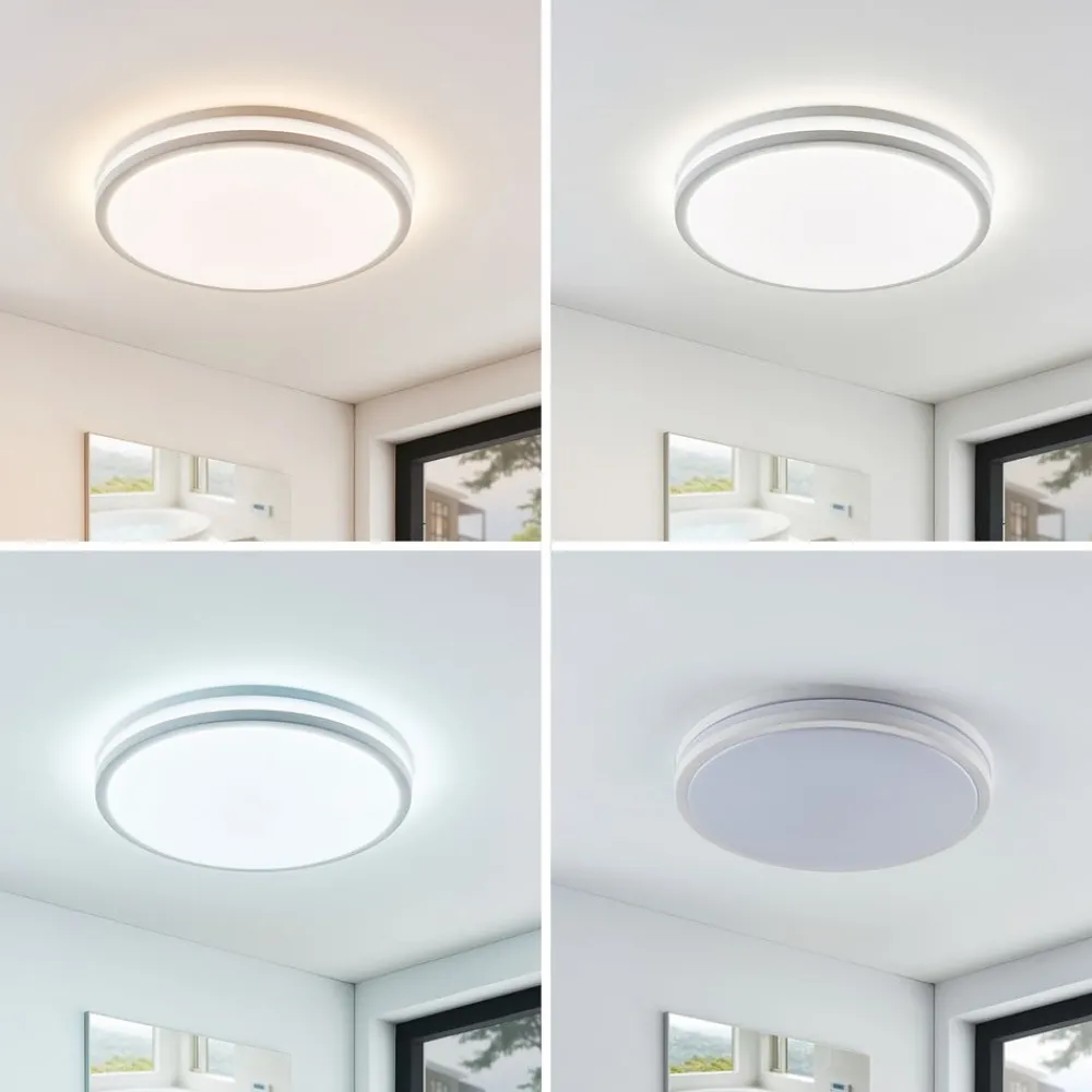 Arnim rund LED-taklampe med fjernkontroll, IP44, dimbar og skiftbar lysfarge Arnim LED-taklampe til våtrom med kapslingsgrad IP44 er designet for bruk på bad og andre fuktige rom. Med sine mange funksjoner kan den også brukes i kommersielle miljøer, der den til enhver tid gir et tilpasset lys. Justeringsmulighetene omfatter både lysfarge og lysstyrke, og det følger med en fjernkontroll for å endre disse funksjonene. Den kan brukes til å variere lysintensiteten i 22 nivåer eller trinnløst, og det samme gjelder lysfargen, som kan justeres i 20 nivåer eller trinnløst fra varmhvit til dagslysets lysfarge. I tillegg kan LED-taklampen styres i fire nivåer via veggbryteren: – full lysstyrke, 3.000 K – full lysstyrke, 4 500 K – full lysstyrke, 6 000 K – nattlysfunksjon med 10 prosent lysstyrke, 3 000 K Begge reguleringsmulighetene har en minneeffekt, slik at når man først har gjort et valg, beholdes det neste gang man slår det på.