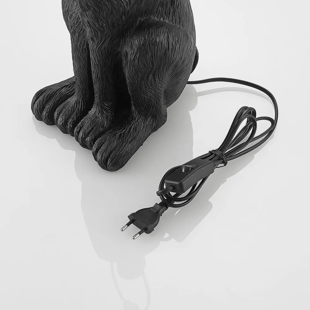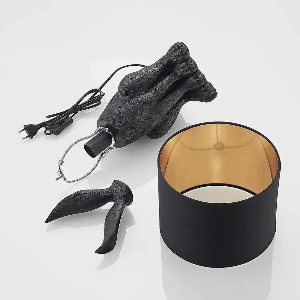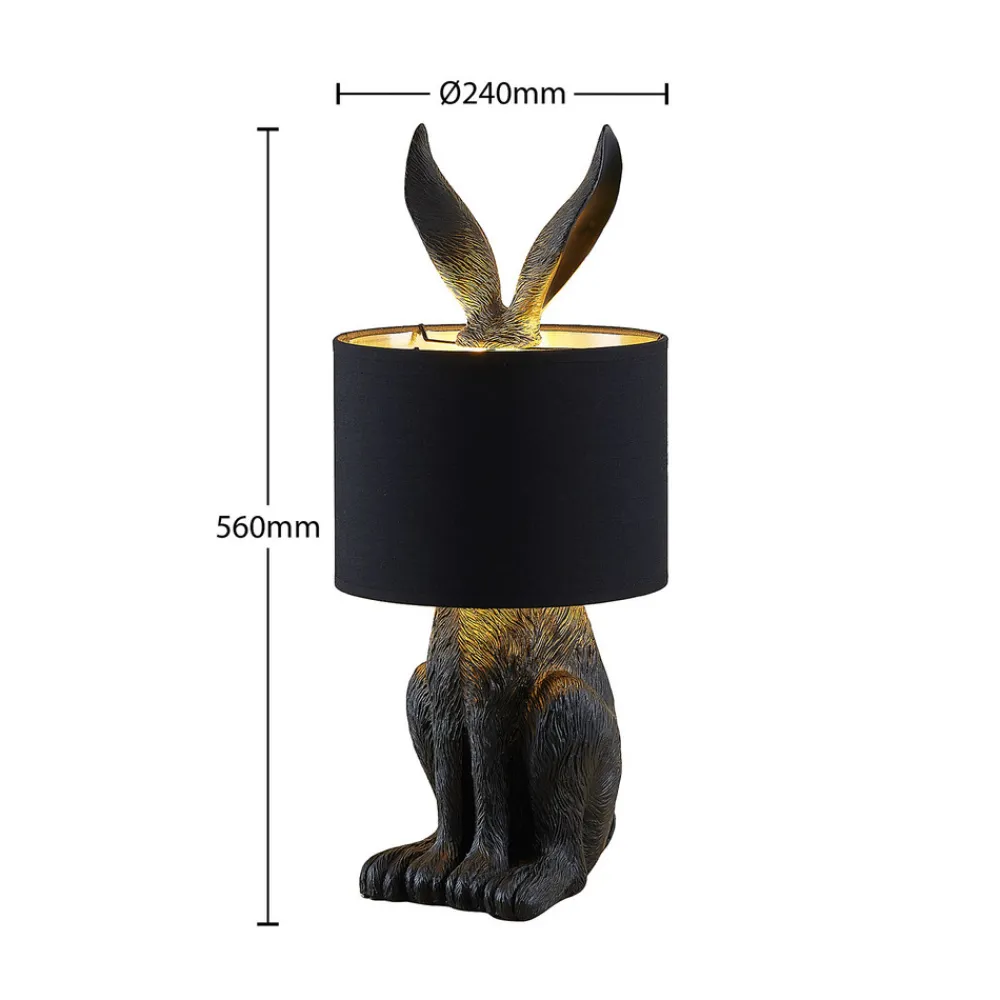 Designorientert Lorentina bordlampe med svart kaninfigur og stoffskjerm i svart og gull Har haren funnet et gjemmested her og så bare gjemt seg bak lampeskjermen, som skjuler den litt? Det ser i hvert fall slik ut, men kjennere vet at harer er altfor iøynefallende til å holde seg skjult i et rom uoppdaget over lengre tid. Og derfor trekkes blikket raskt mot det lange øret, som er dyktig skjult bak den svarte lampeskjermen i stoff. Dette gjør lyskilden til et originalt tilbehør for hele påske- og vårsesongen, men den er selvfølgelig også en iøynefallende dekorasjon i alle andre årstider, som skiller seg ut uten å være slått på, men som gir et spesielt koselig lys når den er slått på, spesielt fordi lampeskjermen i tekstil har en skinnende gylden overflate på innsiden, som reflekterer lyset i en varm tone.
