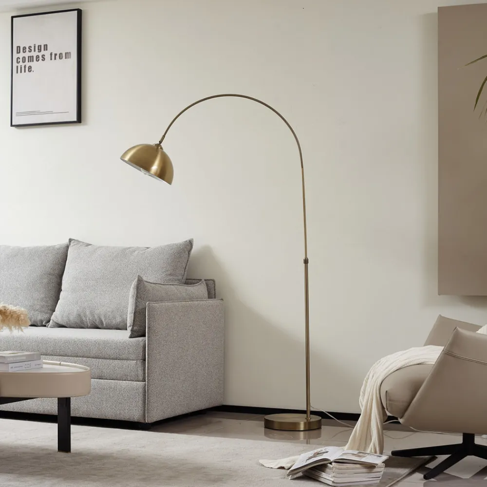 Slående Lennart gulvlampe laget av jern i antikk messing Lennart gulvlampe kombinerer en moteriktig design med praktiske funksjoner. Den er laget av jern og malt i antikk messing. Den består av en base som en bue stiger opp fra og ender i en sveipende lampeskjerm. En E27-pære kan settes inn i skjermen for å generere ønsket belysning. Hvis du også ønsker å gi lampen det lille ekstra, anbefaler vi at du bruker en filamentpære. Buelampen har en kabelbryter som gjør det enkelt å slå den av og på, noe som gir den en viss grad av fleksibilitet. I tillegg er lysbuen høydejusterbar og kan justeres etter behov (141-183 cm). Lennart gulvlampe passer spesielt godt i stuen og er den perfekte følgesvenn når du skal lese en bok i sofaen om kvelden.