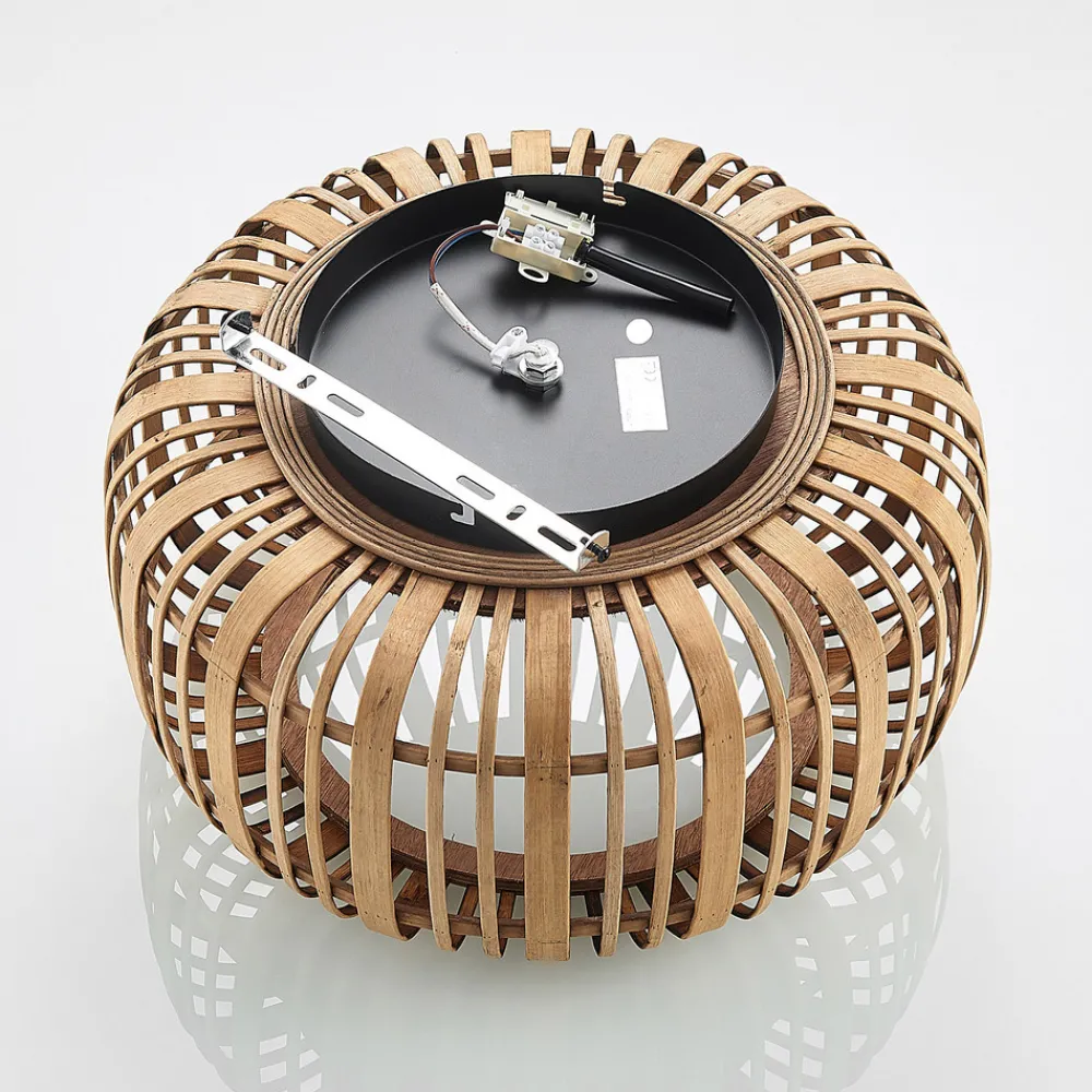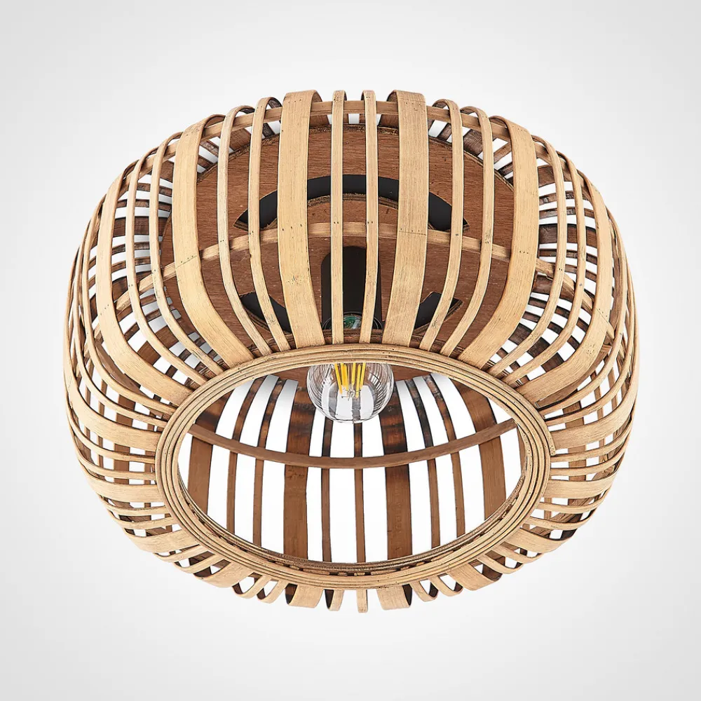 Canyana taklampe med naturfarget rottingskjerm Canyana taklampe har en varm og koselig effekt takket være skjermen som er laget av naturfargede rottingstenger. Takelementet er laget av svart metall og er utstyrt med en E27-fatning i midten. Pæren inne i skjermen er ikke bare synlig fra utsiden, men skinner også effektivt gjennom de mange hullene mellom rottingstengene. Lyset ser veldig pent ut med en globepære. Det sterke lyset bringer en bit av naturen inn i ethvert rom og kan integreres i mange interiører.