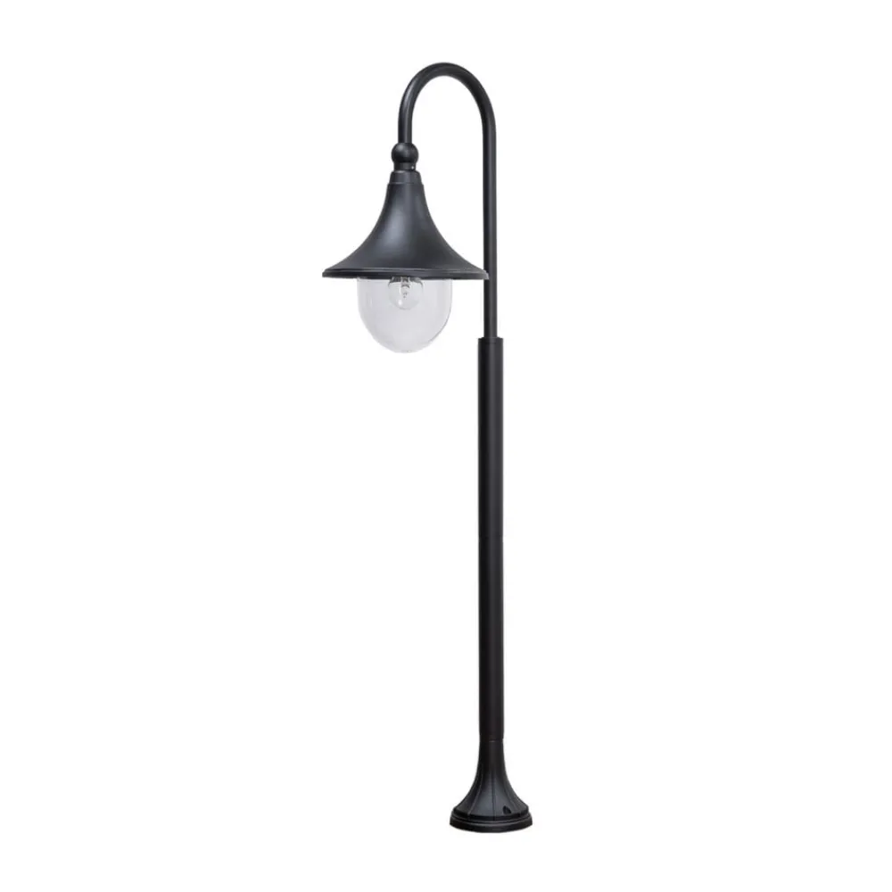 Svartlakkert Daphne veilampe med buet ramme I enkel og tidløs svart passer denne veilampen naturlig inn i mange miljøer, der den gir et stilig utseende og tilstrekkelig lysstyrke til at det blir lettere å finne veien i mørket. Det buede lampehodet strekker seg ut fra den enkle, svarte rammen. Det utvider seg som en bjelle og beskyttes på undersiden av et klart plastdeksel. Det er bevisst unngått overflødige detaljer i utformingen av veilampen, og derfor passer den ikke bare godt inn i klassiske omgivelser, men også i moderne stiler.