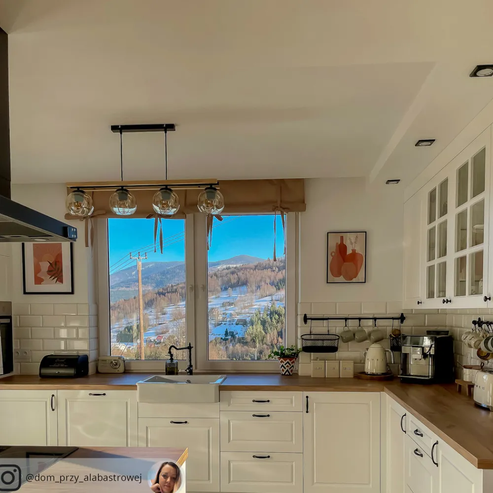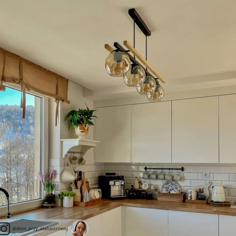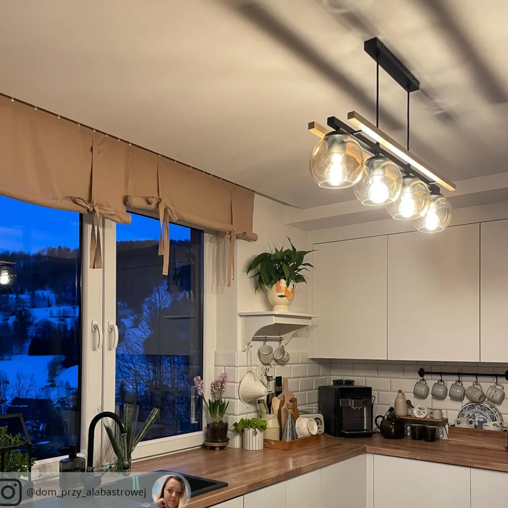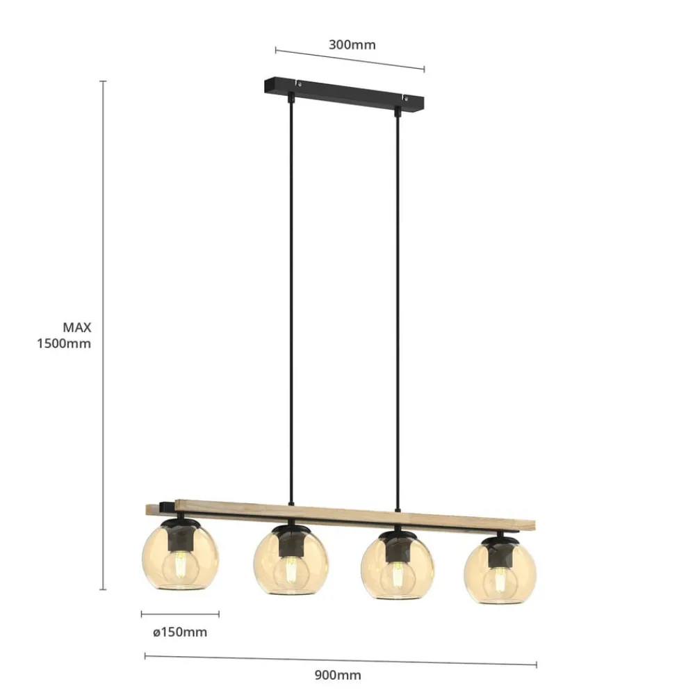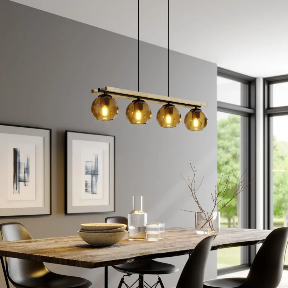 Enrique pendellampe med 4 lyskilder, trebjelke og klare glasskjermer i ravfarget trebjelken som de fire glasskjermene på Enrique sitter på, har en vakker overflate i en lys eiketone, og resten av rammen er laget av matt svart metall. Disse komponentene kompletteres av de fire skjermene, som kjennetegnes av en varmtonet ravfarge og det elegante klare glasset. Dette skaper et tiltalende vintage-look, og lyseffekten drar også nytte av den vakre fargen på skjermene. Et spisebord på kjøkkenet eller i stuen kan belyses vakkert og stemningsfullt med pendellampen Enrique. Når du bruker lampen, bør du være nøye med å bruke matchende lamper, da de er godt synlige på grunn av det klare glasset og utgjør en betydelig del av utseendet.
