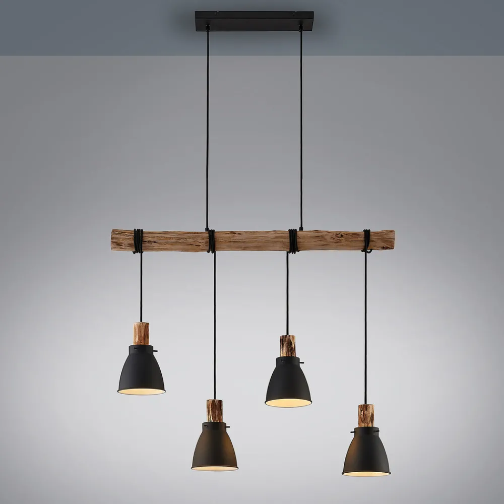 Trebale hengelampe med fire metallskjermer og treelementer Trebale hengelampe med 4 lyskilder er ideell til å belyse et bord. Den imponerer ikke bare med sin materialkombinasjon av matt svartlakkert metall og detaljer på skjermene og et oppheng av eukalyptustre, men også med sin fleksibilitet i opphengssystemet, ettersom skjermene kan vikles rundt treopphenget med kablene sine og dermed henges opp individuelt etter ønske. 4 lyskilder Trebale-pendelen kan utstyres med alle typer lyskilder, og det er også mulig å bruke langvarige og energieffektive LED-pærer. De hvite innsiden av skjermen sørger for optimal refleksjon av lyset, noe som garanterer best mulig lysutbytte. Trebale hengelampe er et naturprodukt, så det kan være forskjeller mellom produktbildet som vises her og den faktiske varen.
