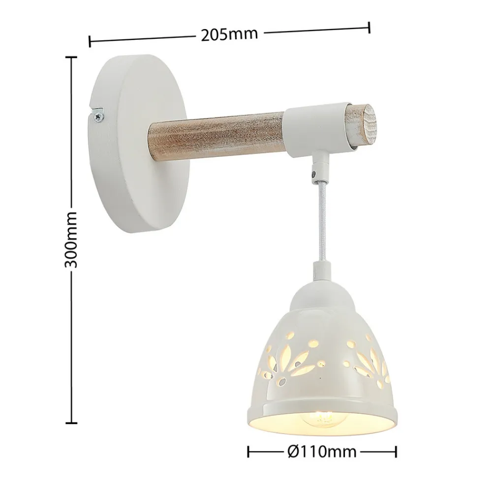 vegglampe Pimana ser veldig dekorativ og samtidig diskret ut på veggen. Dens runde veggbrakett og den horisontalt arrangerte lampearm var laget av stål, med lampearm innkapslet i en tredekor. lampeskjerm er laget av keramikk og er åpen i bunnen. Blomsterutskjæringene gir spesielle lysaksenter i rommet og gir denne lampen en spesiell karakter.