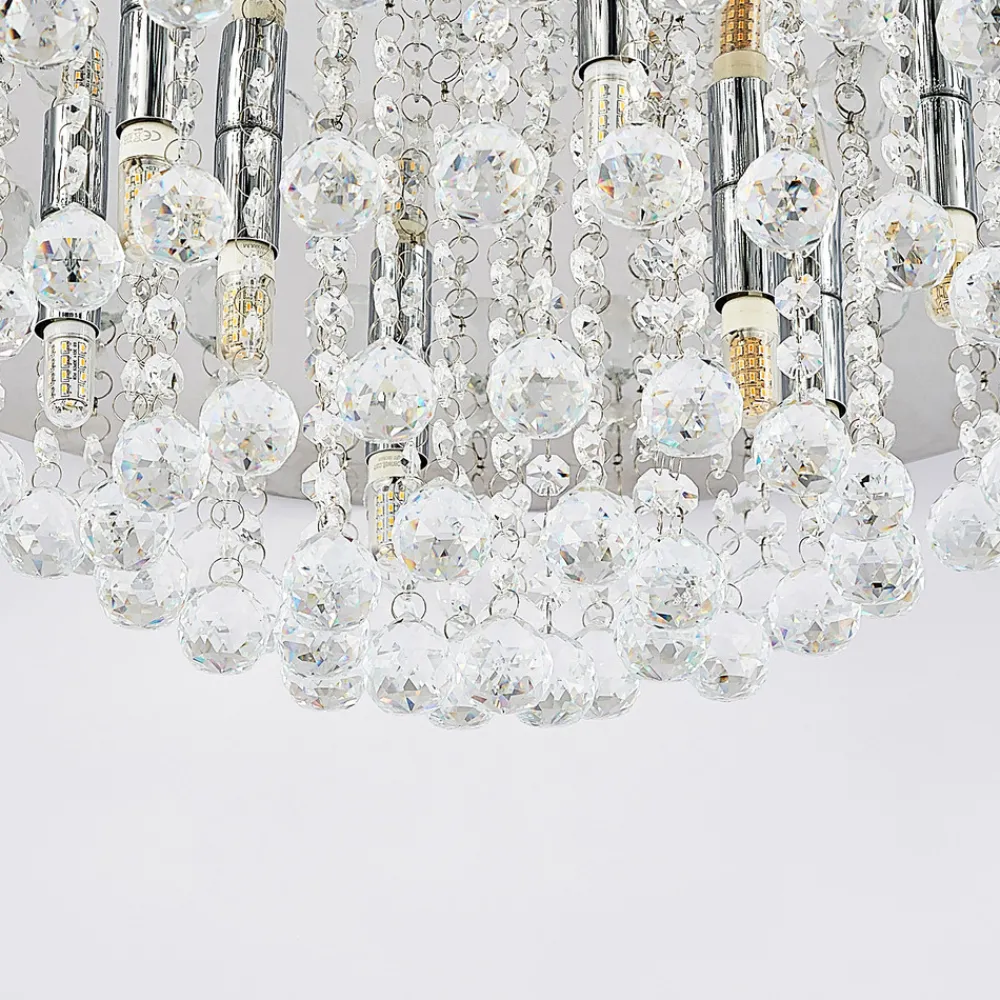 Antonino taklampe med 8 lyskilder og krystallkjeder Antonino taklampe tiltrekker seg alles oppmerksomhet. Fra det kromfargede takfestet i stål henger det flere krystallkjeder som omgir pærene som skal brukes. Fargekombinasjonen av krom og krystallelementer skaper en stilfull atmosfære. Krystallelementenes hjørner og kanter bryter det genererte lyset og fordeler det på en fascinerende måte i hele rommet, noe som skaper en elegant aura. Men selv når den er slukket, er taklampen Antonino et verdifullt dekorativt element som skaper iøynefallende aksenter i interiøret takket være den glitrende krystallen. Dette gjør taklampen til den perfekte partneren når det gjelder elegant dekorasjon og spennende belysning av et rom.