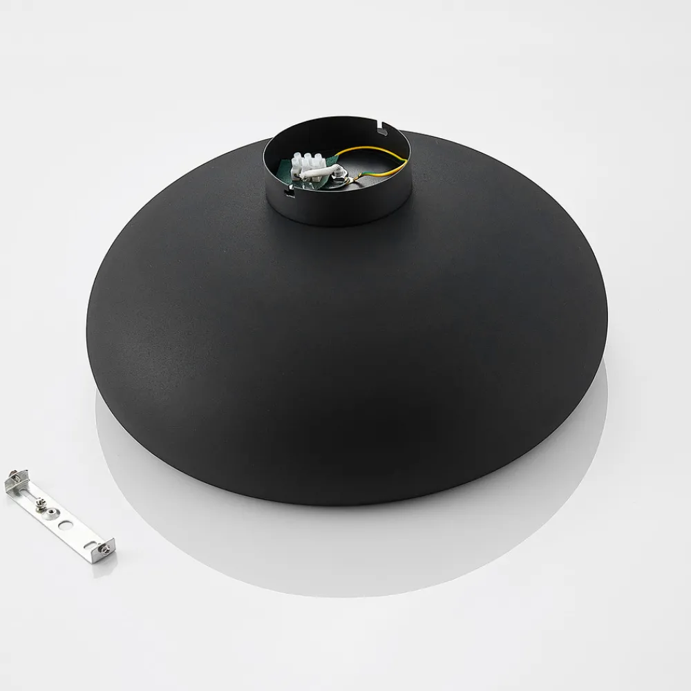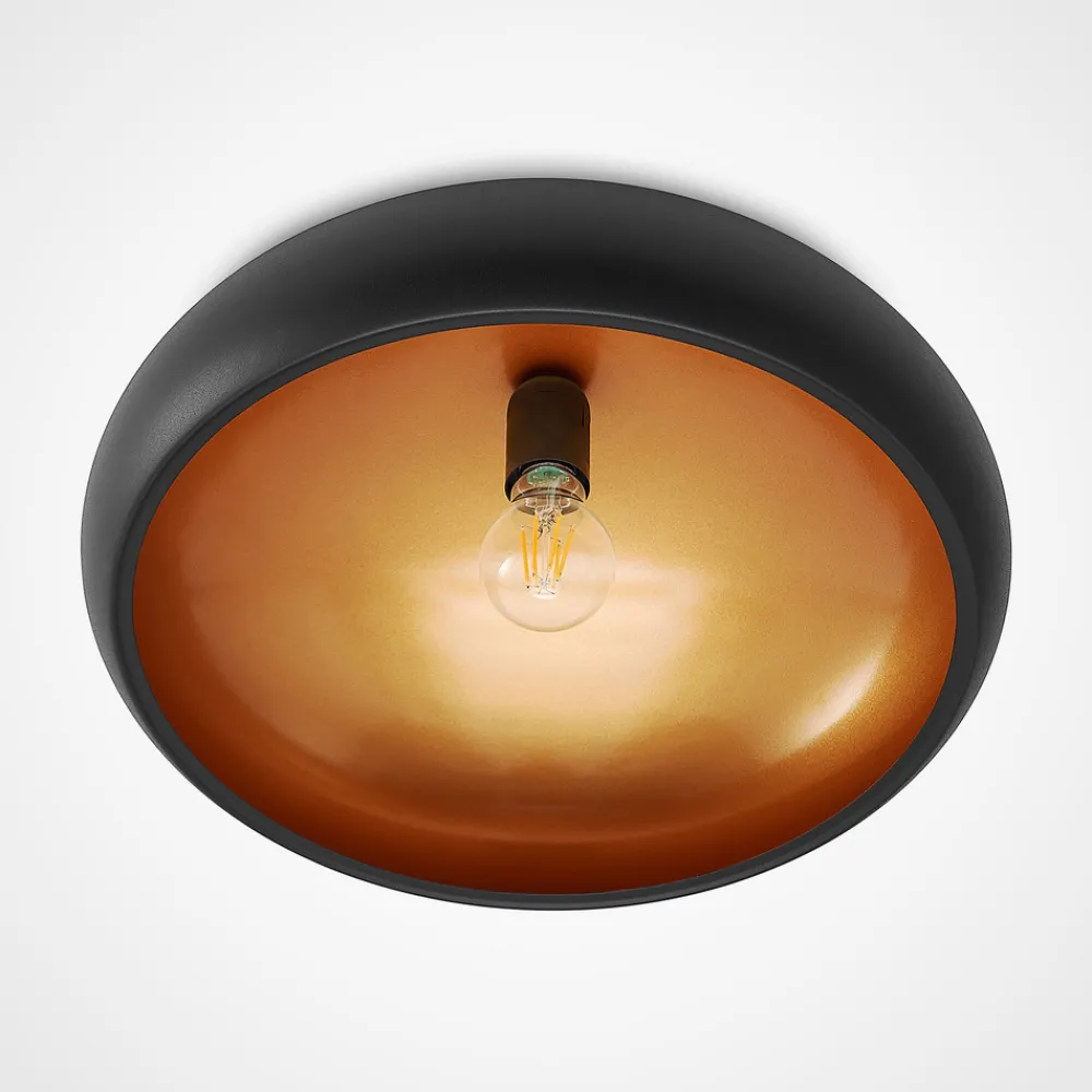 Rund taklampe Gerwina i metall med gullfarget innside for vakkert lysutslipp Gerwina er en taklampe som er perfekt for innendørs bruk, der den lyser opp gang, soverom og oppholdsrom like godt. Skjermen, som er åpen i bunnen, er pæreformet og rund i formen og har en svart utside, mens innsiden er farget i matt gull. Kontrasten skaper ikke bare et vakkert uttrykk, noe som har vært absolutt trendy en stund nå, men også et varmt og koselig lysmønster fordi lyset reflekteres så vakkert av gullfargen. Skjermens åpenhet understreker også lyskilden og bør velges med omhu. Rustikke lamper eller filamentpærer, som har utseendet til en klassisk tradisjonell glødepære og som nå også fås med ekstra varme lysfarger og effektiv LED-teknologi, ser veldig stilige ut.