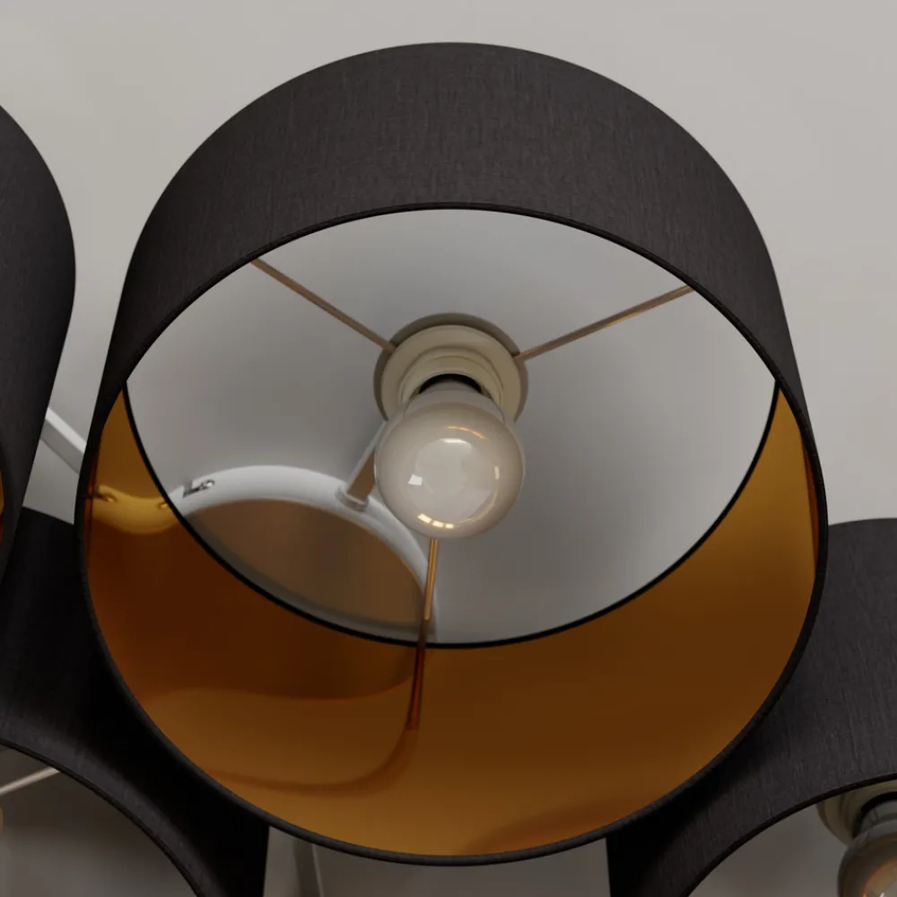 Laurenz taklampe med fem runde lampeskjermer i stoff i svart og gull Laurenz har fem lampeskjermer i forskjellige størrelser som er satt sammen for å skape et svært interessant, moderne uttrykk som vil pynte opp i hjem og forretningslokaler. Hver skjerm er rund og sylindrisk og er svart på utsiden. Innsiden er derimot dekket med skinnende gullfolie, noe som ikke bare har en positiv effekt på utseendet, men også på lysmønsteret, fordi lyset da reflekteres så vakkert varmt. E27-lampene kan velges fritt, og i versjonen med 5 lyskilder kan taklampen Laurenz gi et godt lysnivå slik at den lett kan brukes som hovedbelysningen i rommet. Vi anbefaler spesielt energibesparende LED-pærer, ofte i det populære filamentpære-looket, som er inspirert av det klassiske lyspærelooket.