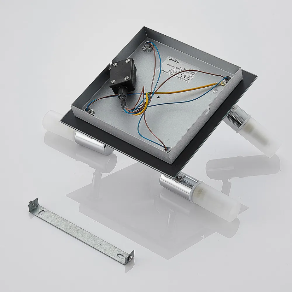 Kvadratisk taklampe Zela, 4 lyskilder Gir et behagelig lys på badet så vel som i alle andre rom: Zela taklampe er en liten, firkantet lampe med fire sylindriske spotlights, som er utstyrt med melkehvitt glass og kan justeres individuelt. De enkelte spotlightene kan plasseres på nesten hvilken som helst måte, enten de vendes til siden eller vippes oppover eller nedover. Det blanke kromlooket passer også inn i mange ulike romkonsepter og smelter diskret inn overalt.