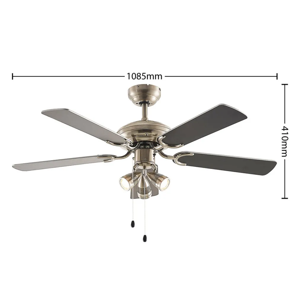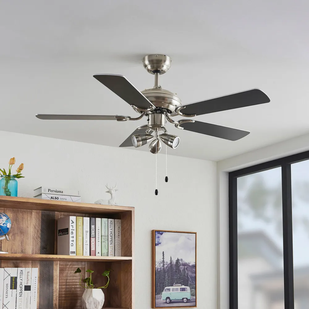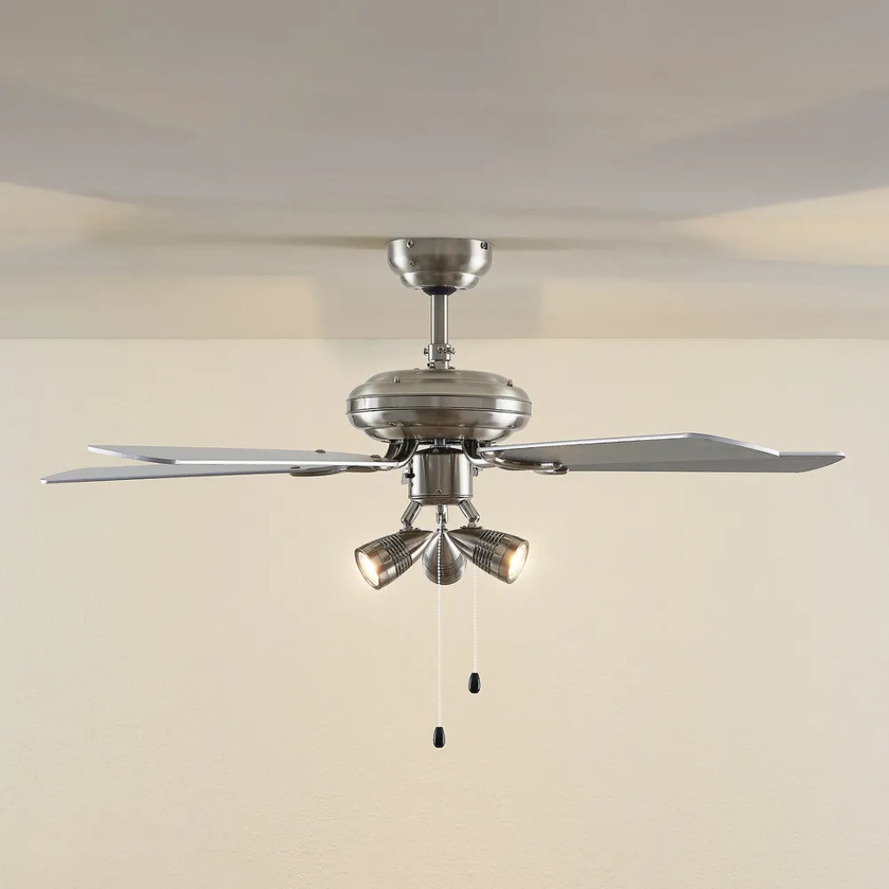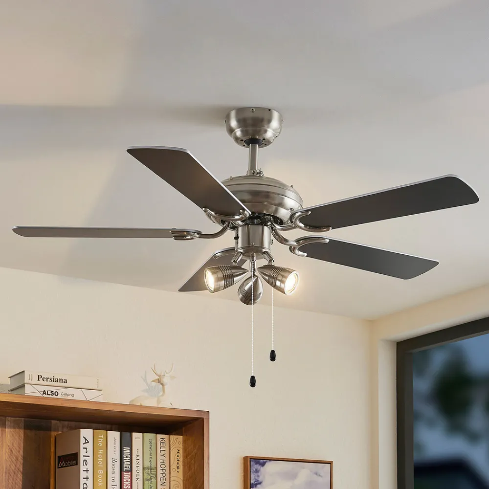 Tidløs takvifte Anariki i stål og tre i en slående fargekontrast Anariki har fem blader som roterer rundt en sølvfarget kropp, som er utstyrt med tre fatninger for tilsvarende lyskilder. Fargevalget i svart og sølv skaper en attraktiv kontrast og avrunder designet. Funksjoner Viften og lyset styres ved hjelp av to trekkbrytere. I tillegg kan du bytte fra forover til bakover ved å trykke på bryteren på huset til takviften Anariki. Tekniske data Motorhastighet: 180/130/80 o/min Motoreffekt: 40/27/20 watt Luftsirkulasjon: 58,8/33,75/19 m³/min Vifte lydnivå: 43,5/40/38 dB