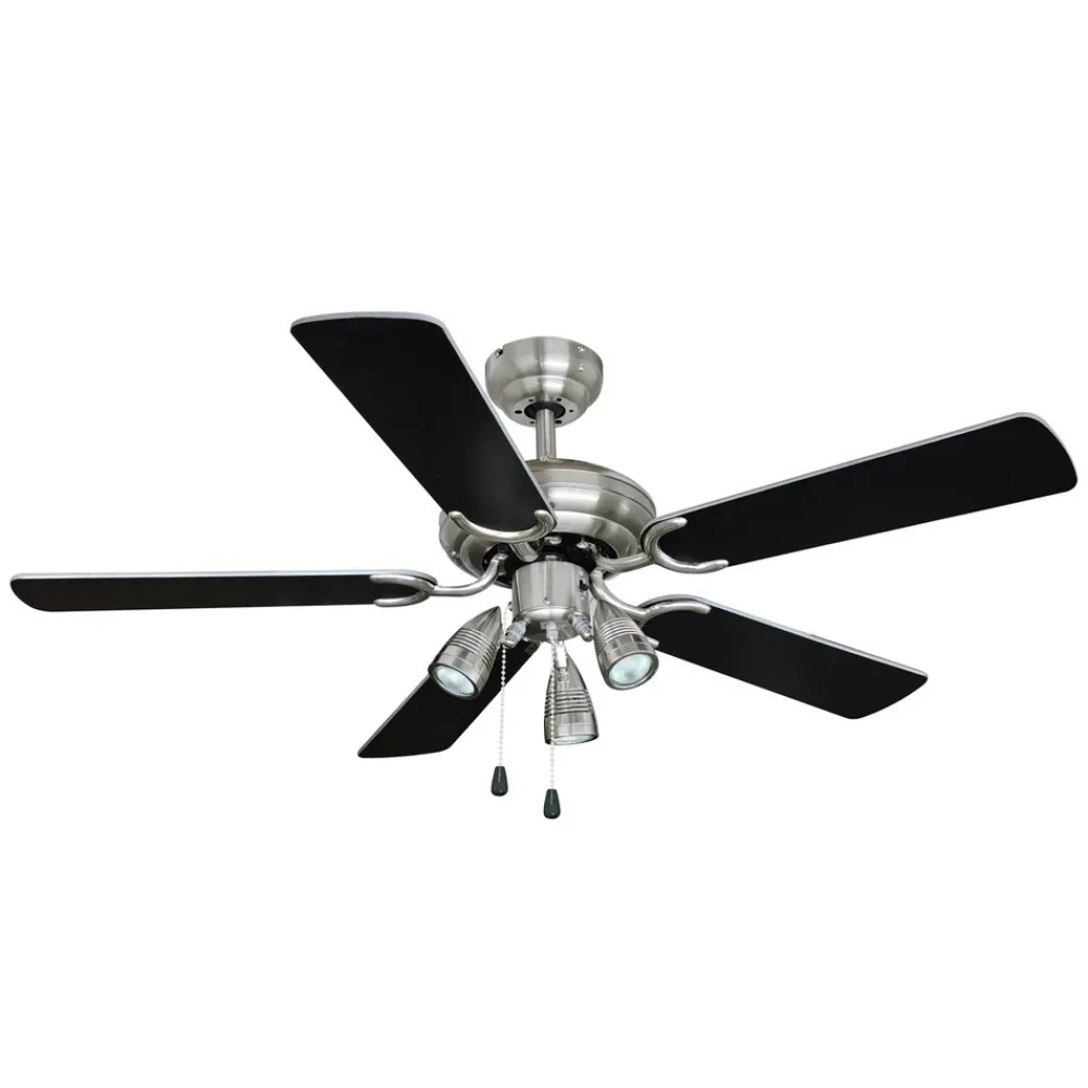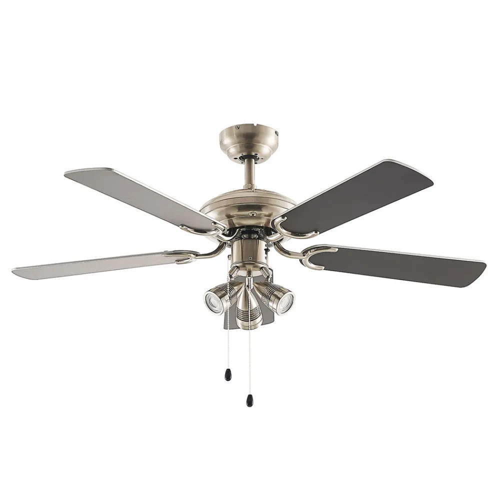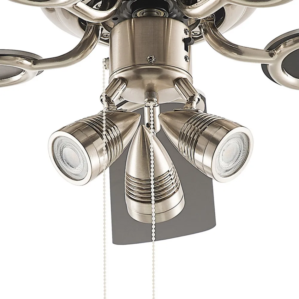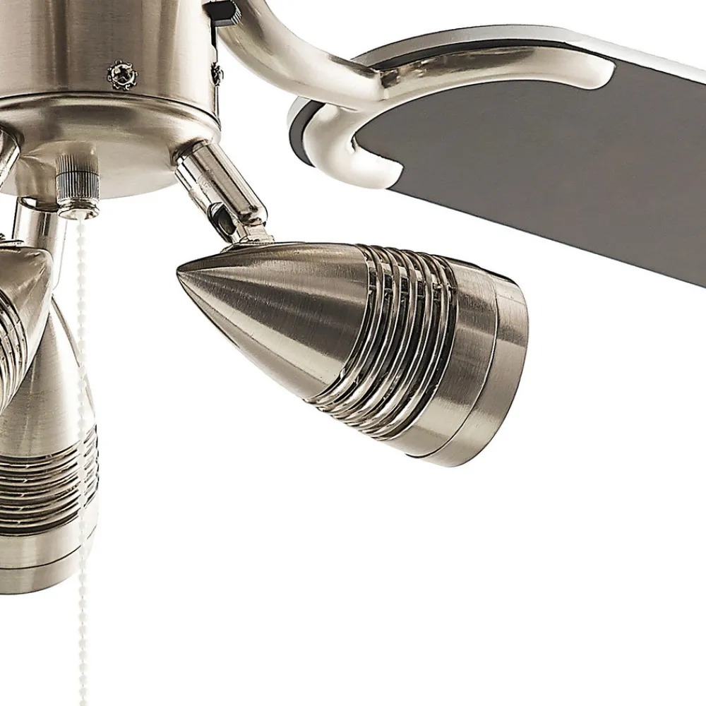 Tidløs takvifte Anariki i stål og tre i en slående fargekontrast Anariki har fem blader som roterer rundt en sølvfarget kropp, som er utstyrt med tre fatninger for tilsvarende lyskilder. Fargevalget i svart og sølv skaper en attraktiv kontrast og avrunder designet. Funksjoner Viften og lyset styres ved hjelp av to trekkbrytere. I tillegg kan du bytte fra forover til bakover ved å trykke på bryteren på huset til takviften Anariki. Tekniske data Motorhastighet: 180/130/80 o/min Motoreffekt: 40/27/20 watt Luftsirkulasjon: 58,8/33,75/19 m³/min Vifte lydnivå: 43,5/40/38 dB