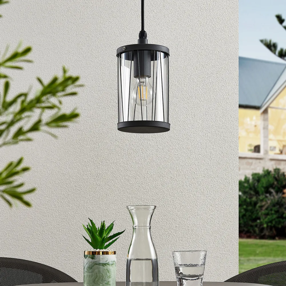 Rund utendørs pendellampe Yonan med smale striper skråstilling