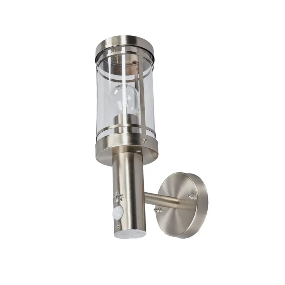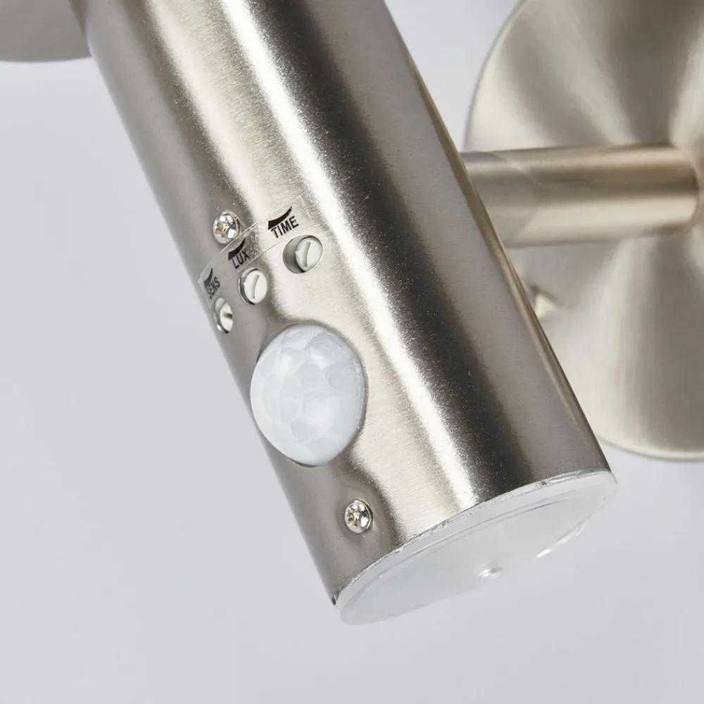 Praktisk Djori vegglampe med sensor for utendørsbruk Djori er designet for utendørsbruk og er utstyrt med en sensor. Dette gjør at vegglampen bare tennes når den registrerer bevegelse i umiddelbar nærhet. Rekkevidden er variabel og kan stilles inn til maksimalt 8 meter, mens registreringsvinkelen er 90°. Lysets varighet er også justerbar og kan stilles inn mellom 10 s og 4 min. Rammen til vegglampen med sensor er laget helt i rustfritt stål og har et moderne utseende. Innsatsen rundt pæren er laget av klar plast og garanterer derfor full lysstyrke.