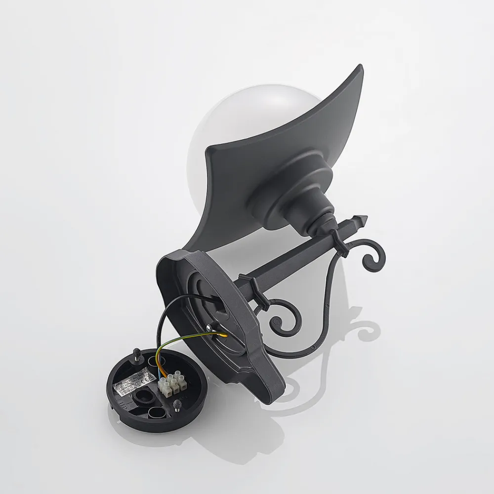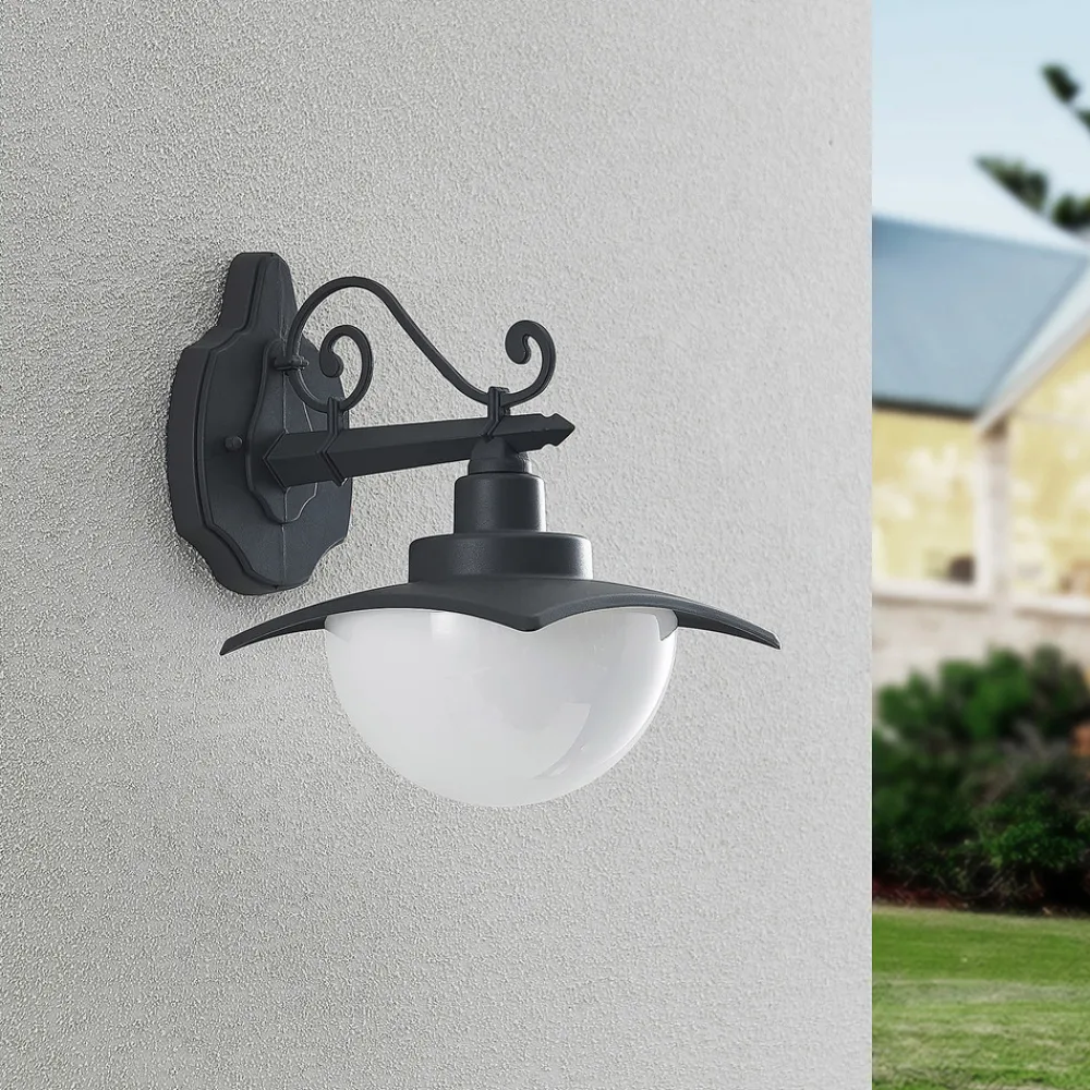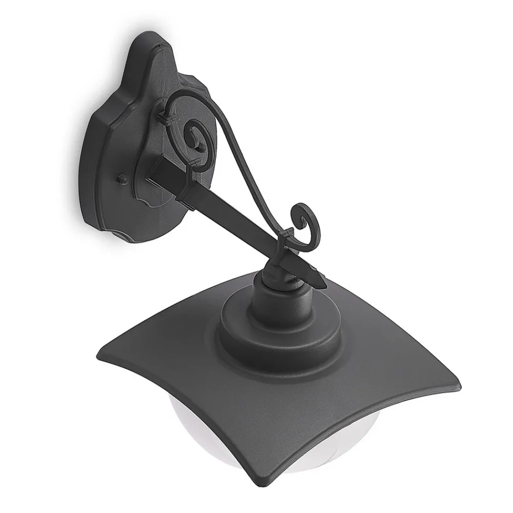 Elinda utendørs vegglampe med et designorientert utseende Elinda utendørs vegglampe kombinerer nostalgi og landlig sjarm i sitt spesielle utseende. Veggfesten, lampearmen og lampeskjermens hus er alle individuelt formet og har vakkert designede elementer som harmonerer godt med hverandre. Lyset sendes ut direkte nedover, og lyskilden beskyttes av en lampeskjerm i hvitt glass. Dette avrunder Elindas uttrykk på en perfekt måte, og har også den fordelen at lyset sendes ut i omgivelsene på en skånsom og blendingsfri måte.
