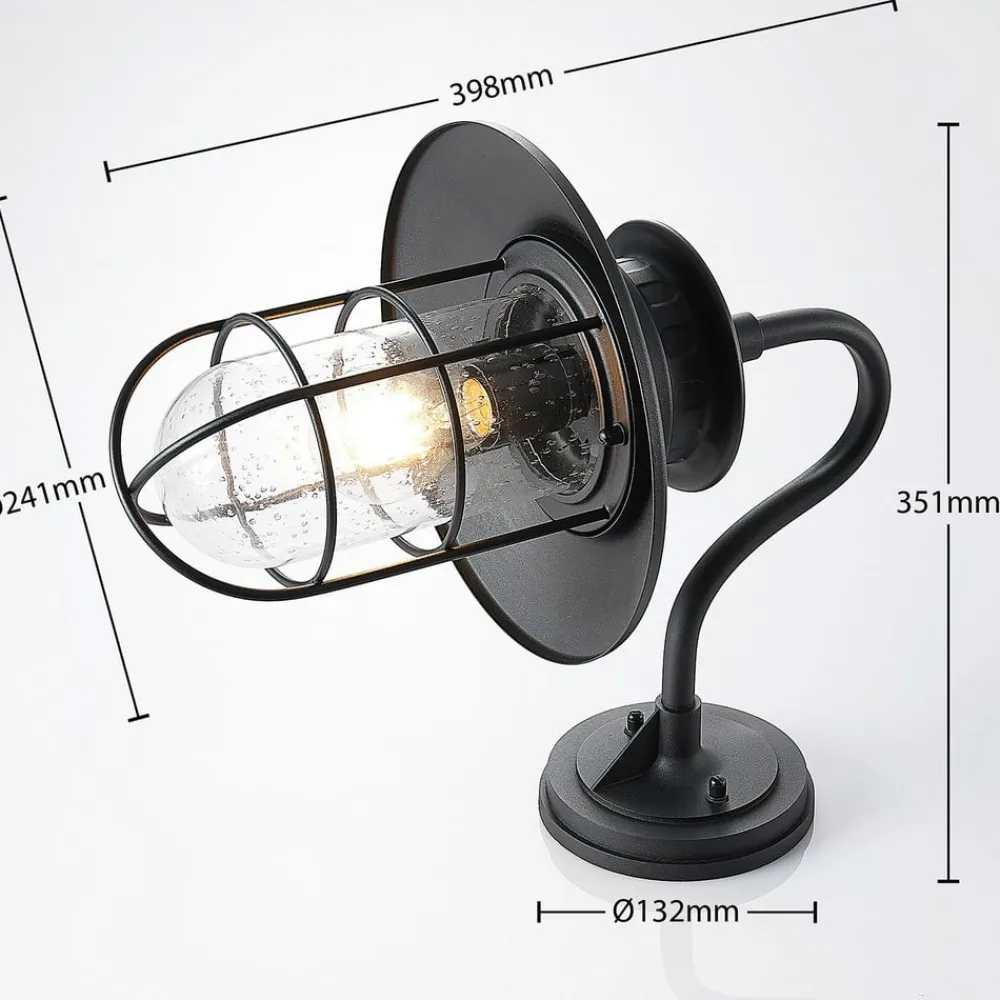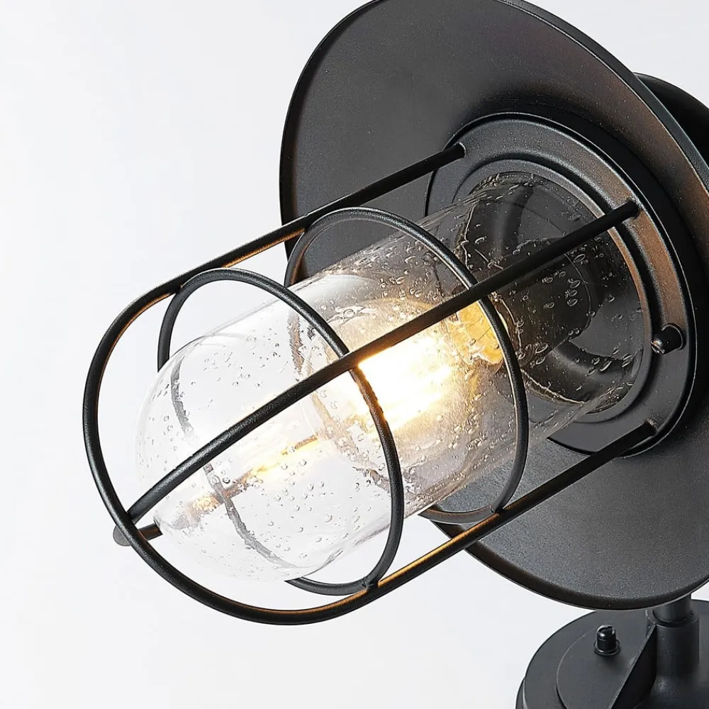 Nostalgisk Kyan utendørs vegglampe i bueform Den vakkert formede Kyan utendørs vegglampe tar seg flott ut utendørs ved husinnganger, på terrasser eller verandaer. Med sin buede form og beskyttende glasskropp med metallgitter ser den spesielt harmonisk ut på eldre bygninger. Det klare glasset, som kan inneholde små luftbobler, gir fri sikt til pæren. Bruk av dekorative filamentpærer eller retrofit-pærer kan forsterke armaturens nostalgiske effekt ytterligere.