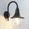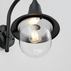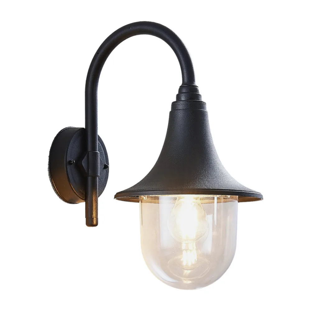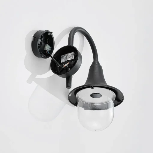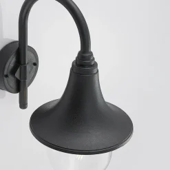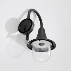 Buet utendørs vegglampe Nalevi i svart, saltvannsresistent, IK06 Den buede lampearmen på Nalevi fører til en lampeskjerm som utvides nedover og ender i en klar kuppel av polykarbonat i bunnen. Alle komponentene er laget av plast og er sjøvannsbestandige, noe som gjør dem spesielt robuste og egnet for montering i områder der omgivelsene domineres av salt luft. Pæren er godt synlig fra utsiden på grunn av den klare kuppelen og skal derfor passe godt inn i den generelle designen. Dette gjelder alle lyskilder med glødepærelook, inkludert LED-pærer med glødepærelook. Den overordnede designen til utendørs LED-vegglampen har et klassisk preg og mangler ikke en antikk karakter, noe som gjør at Nalevi passer spesielt godt til historiske bygninger.