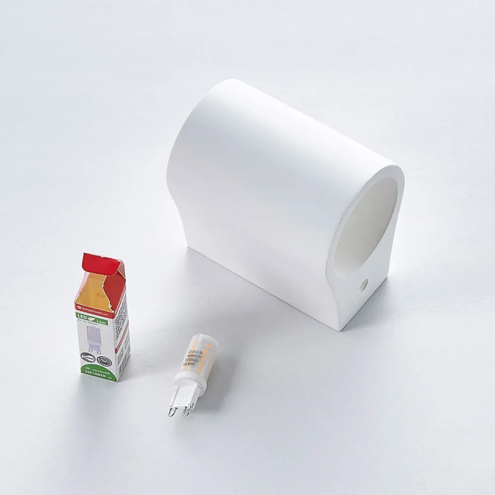 Halvsirkelformet Jannes vegglampe med lys rettet oppover og nedover Lampekroppen på denne vegglampen er laget av gips, et materiale som har hatt stor popularitet i belysningssektoren i flere år. Den imponerer ikke bare med sitt harmoniske utseende i hvitt, men også med muligheten til å male eller farge overflaten etter eget ønske.
