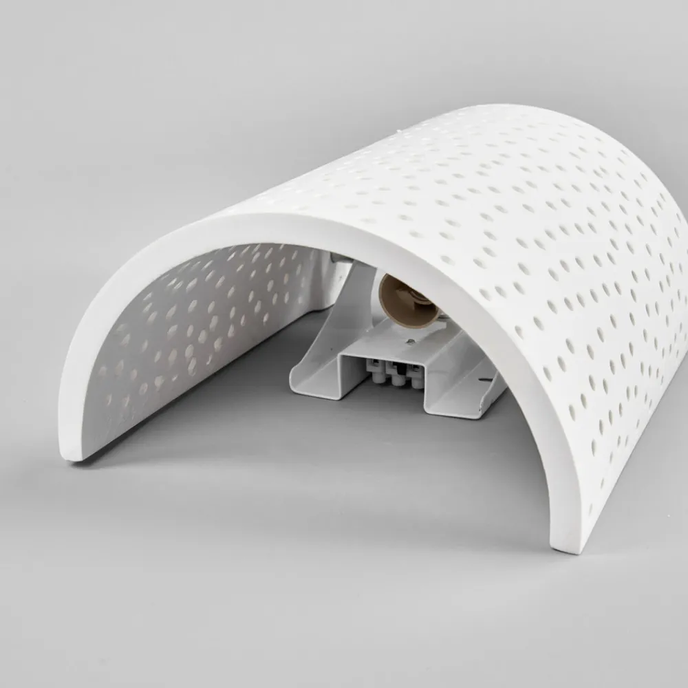 Jiru vegglampe i gips med dekorativt hullmønster Skjermen på denne vegglampen i gips er svakt buet som en skjerm, og det meste av lyset slipper ut oppover og nedover. Men siden gipsoverflaten ikke er gjennomgående, men har utallige små hull som til sammen danner et vakkert hullmønster, slipper det også ut litt lys her, og du kan se et herlig glimt av mange lyspunkter som kunstferdig bryter gjennom skjermen. Vegglampen Jiru egner seg derfor spesielt godt som tilleggs- eller aksentbelysning, da fokuset naturligvis ikke ligger på sterk belysning, men på en stemningsfull effekt.