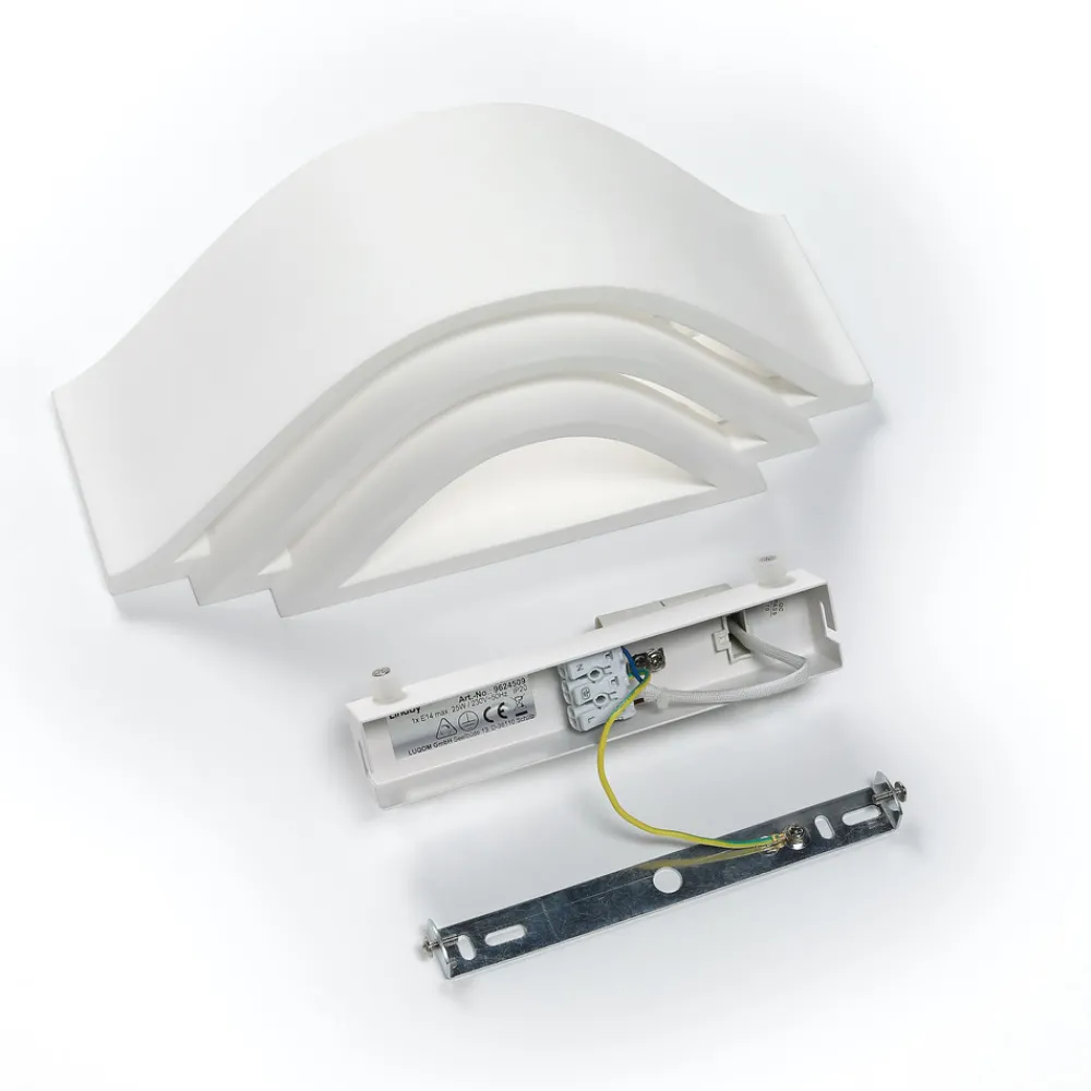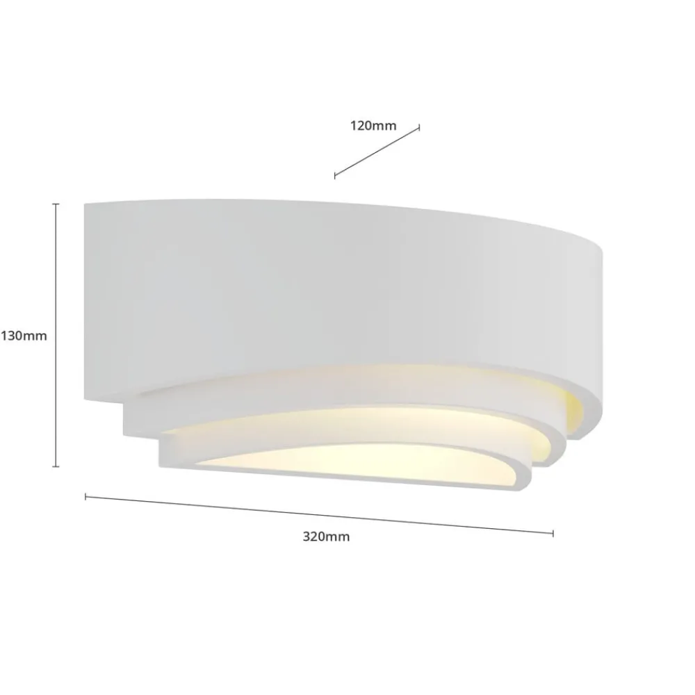 Lucien tredelt, halvsirkelformet vegglampe i hvit gips Lucien er en fantastisk lyskilde for koselig belysning i oppholdsrom. Lampeskjermen har en halvsirkulær form, er åpen øverst og nederst og er satt i tre nivåer, noe som skaper spesielle lyseffekter. Fordi pæren ikke er direkte synlig, blir lyset blendfritt og svært koselig. Denne effekten kan forsterkes ved å velge en passende lyskilde, for LED-pærer finnes i mange varianter, f.eks. med en ekstra varmhvit lysfarge eller integrert dimmeteknologi som gjør det mulig å regulere lysstyrken i flere trinn ved hjelp av veggbryteren. Gipskroppen ser stilren og harmonisk ut med sin hvite overflate, men det er også mulig å ta frem pensel og maling og skape et individuelt overflatedesign i form av en ensfarget maling eller et vakkert motiv med den. Det finnes virkelig mange måter å være kreativ på og integrere lyset i rommet på.