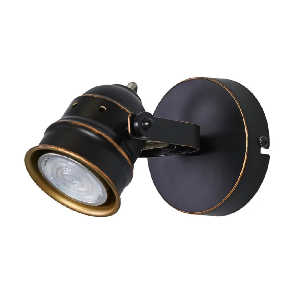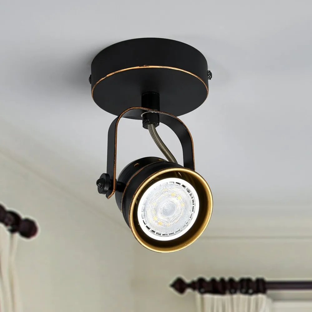 Antik GU10-spot Leonor for vegg eller tak I versjonen med 1 lyskilde kan denne spoten brukes på en rekke forskjellige måter og kan monteres på veggen eller i taket. Fordi skjermen kan justeres, er det ingen problemer med å rette lyset. Visuelt har spoten en antikk effekt, noe som skyldes både formen og fargevalget, ettersom den svarte overflaten har fått gylne detaljer.