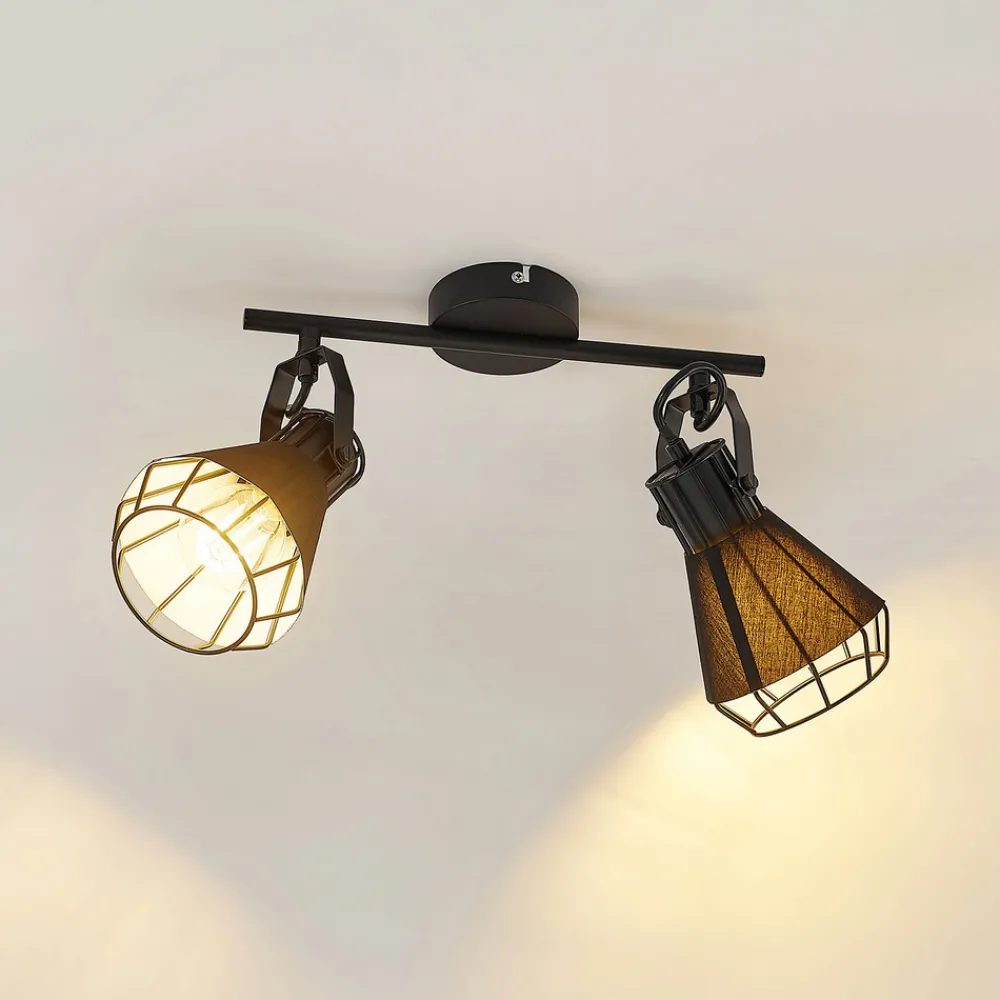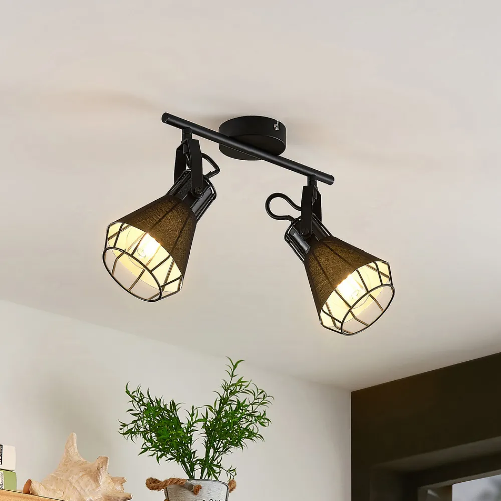 Yusei spotlight imponerer med sitt slanke og robuste utseende. En tynn stiver med to takfeste er festet horisontalt til et kompakt takbrakett . Disse kan utstyres med E27-lamper og genererer riktig lys for en stue eller en gang. Yusei- spotlight er laget av jern og nyanser er dekket med stoff, og den er helt svart, noe som gir den en rolig karakter. Spotlighten setter slående aksenter på taket i leiligheten og avrunder resten av møblene.