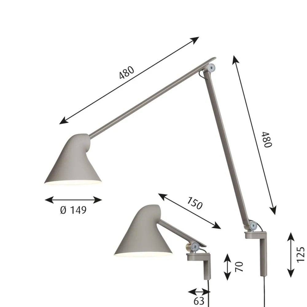 Lysstyrken kan reguleres til 50 eller 100 % med bryteren på lampehodet. I tillegg har NJP en tidtakerfunksjon som deaktiverer lampen etter fire eller åtte timer. Lampen kan også justeres fysisk: Armen som bærer lampehodet er festet til veggen med et vippbart hengsel.