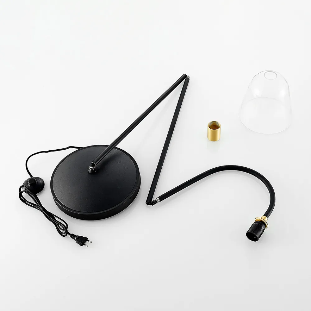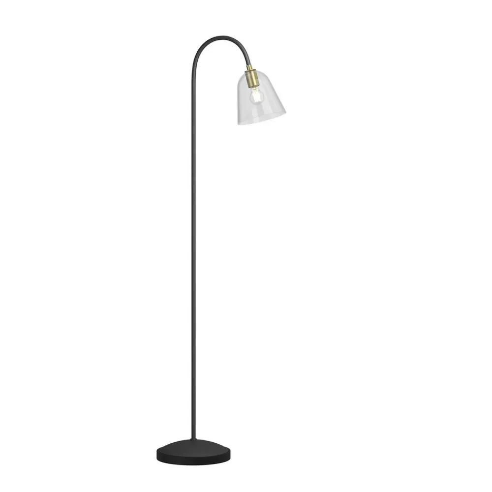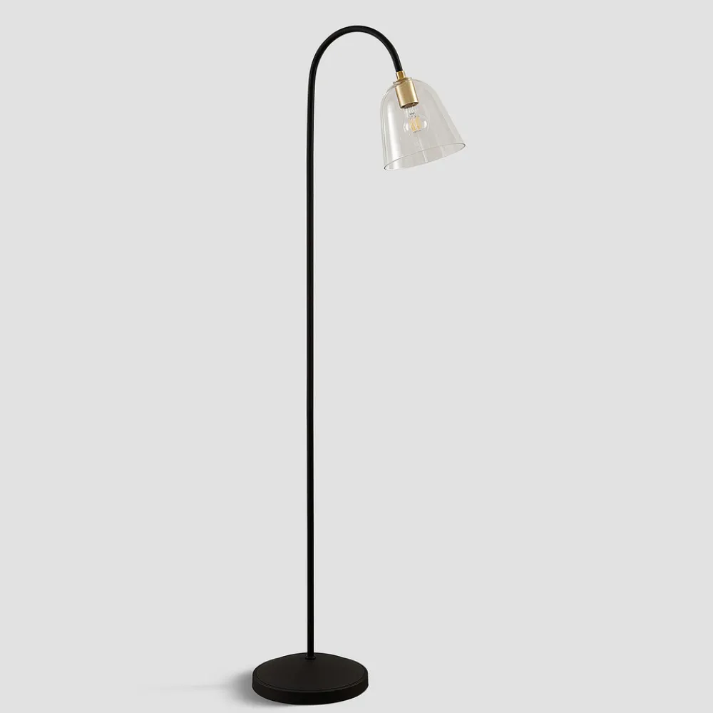 Bøyd gulvlampe Anjita med glasskjerm og svart stamme