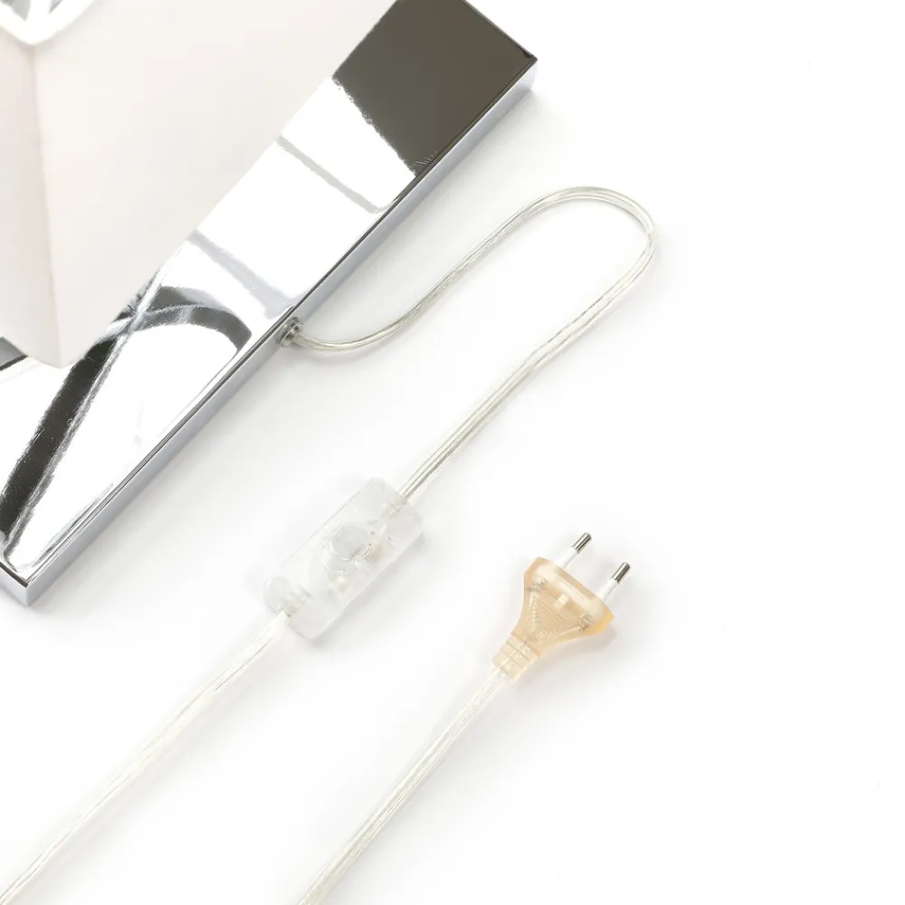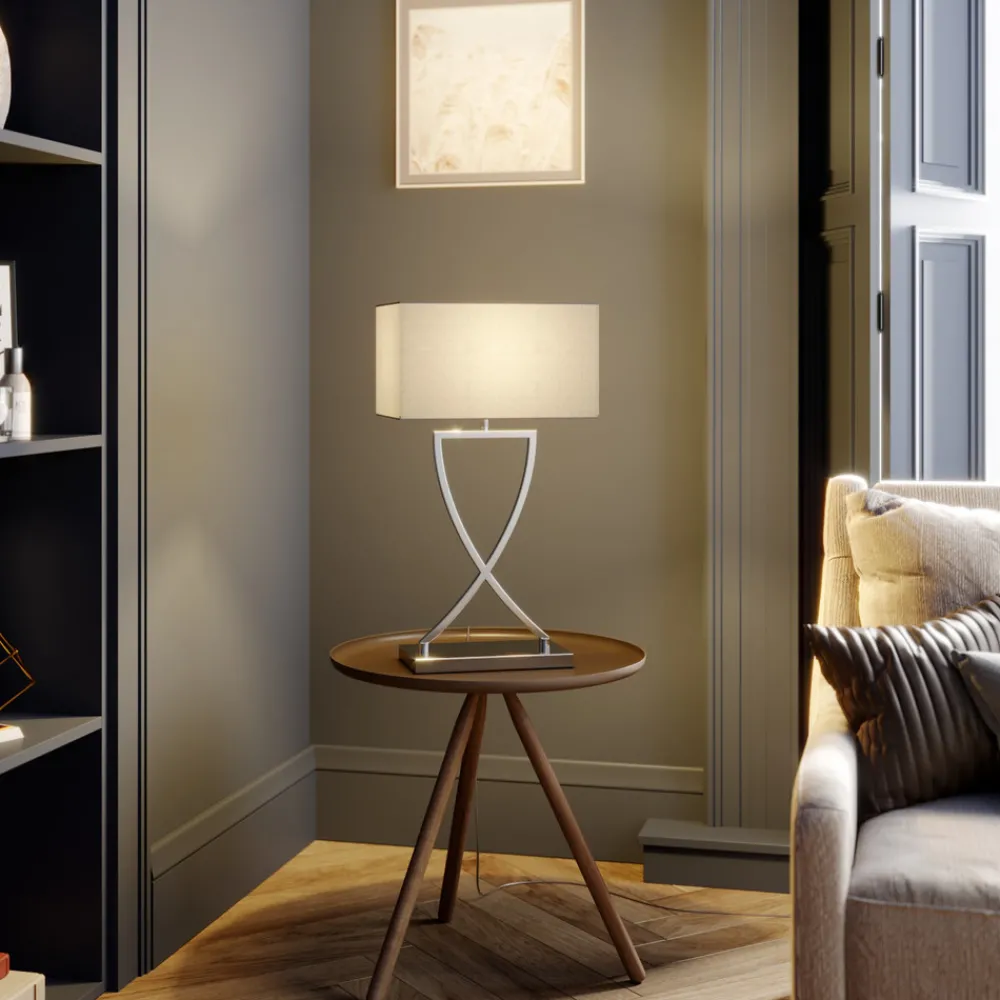 Ren eleganse – Evaine bordlampe Enkelhet og eleganse, disse to ordene beskriver Evaine bordlampe på en treffende måte. Den har en rektangulær, moderne lampeskjerm i behagelig hvitt, som troner på en kromfarget ramme. Denne er stilfullt buet og utgjør et spesielt blikkfang. Evaine er ideell som ekstra belysning i moderne oppholdsrom, for eksempel på en kommode i stuen.