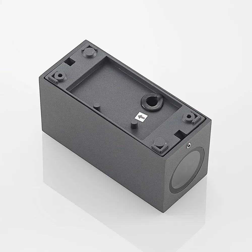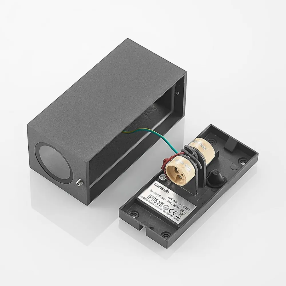Utvendig vegglampe Cimala ble laget av støpt aluminium som en kasse med lysuttak rettet oppover og nedover. Den mørkegrå kroppen ble forsynt med treapplikasjoner på siden og foran, slik at nesten ingenting av metallkroppen er synlig. GU10-kontaktene, som skal være utstyrt med LED-lamper, sitter bak satinert glassdekslene bak de sirkulære lysuttakene. Lyset som skinner oppover og nedover setter effektivt scenen for hver fasade – spesielt når flere lys er installert, for eksempel ved siden av en inngang eller til høyre og venstre for vinduer eller dører.