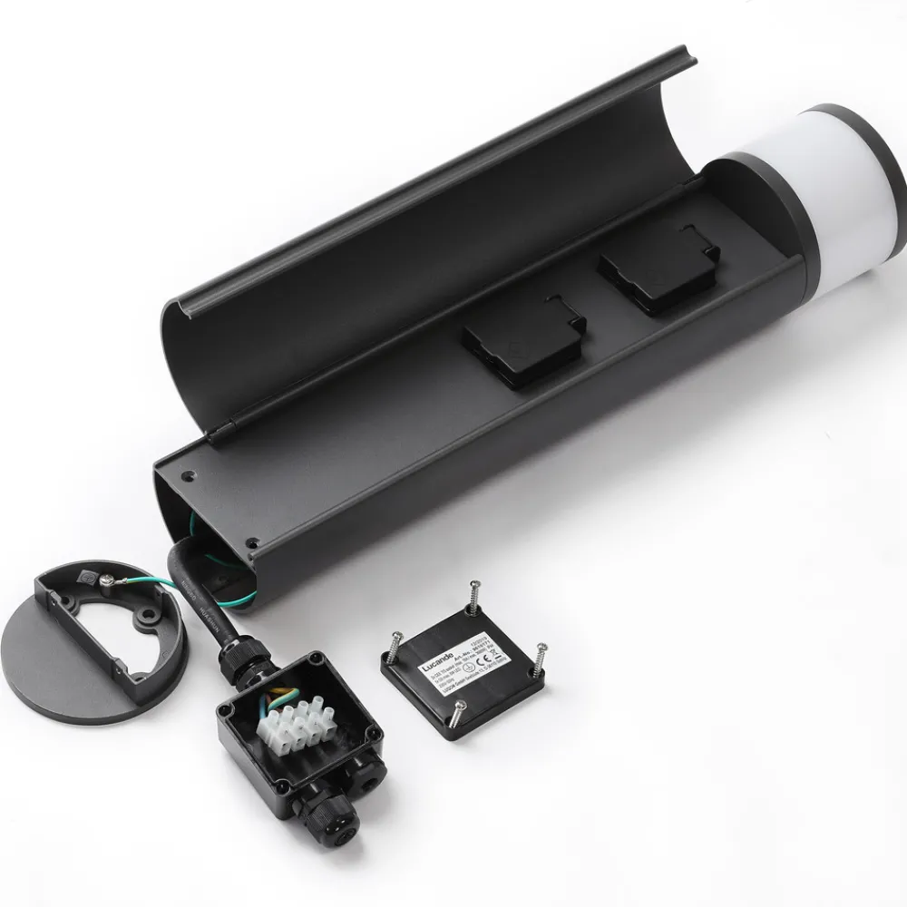Corban sokkellampe med to stikkontakter Corban sokkellampe bringer ikke bare lys inn i mørket, men gir også strømforsyning utendørs. Armaturen har et slankt aluminiumshus med to innebygde stikkontakter for en maksimal samlet effekt på 3680 watt, som er skjult bak en dør. En hvit diffusor er innfelt i toppen av armaturen for å sikre en jevn lysfordeling.