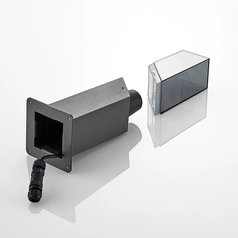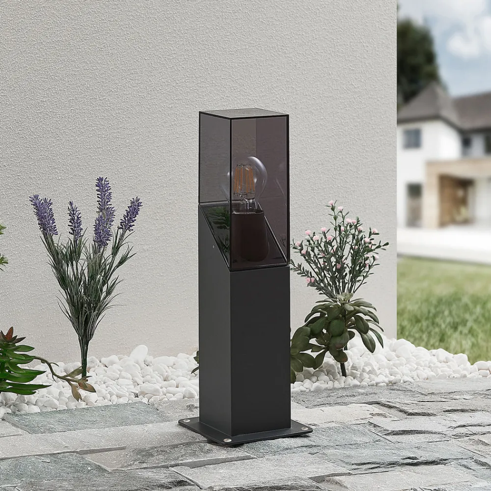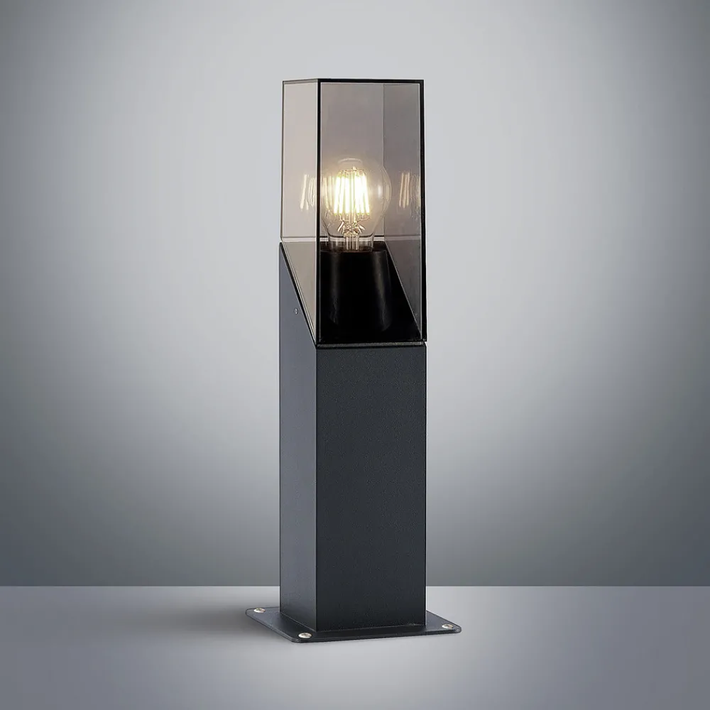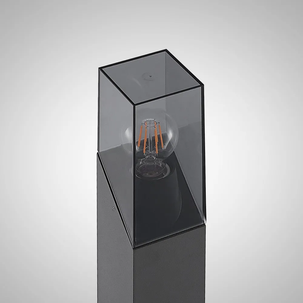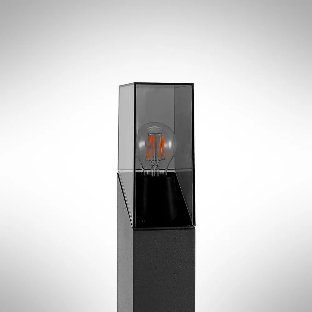 Moderne utelamper – Fiola sokkellampe Den geometriske formen på Fiola sokkellampe og den spesielle lampeskjermen fanger umiddelbart blikket til den som ser på denne utelampen. Sokkellampen består av en kantet kropp i mørkegrå aluminium. Fatningen til pæren er plassert på den avfasede toppen, som er innkapslet i en gjennomsiktig, lys røykgrå plast. Ideelt sett brukes her en dekorativ glødetråd eller en pære, noe som understreker Fiola sokkellampens moderne utseende.