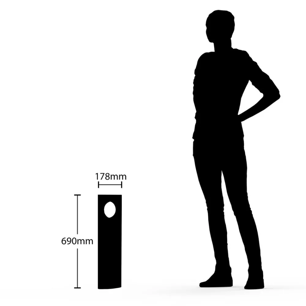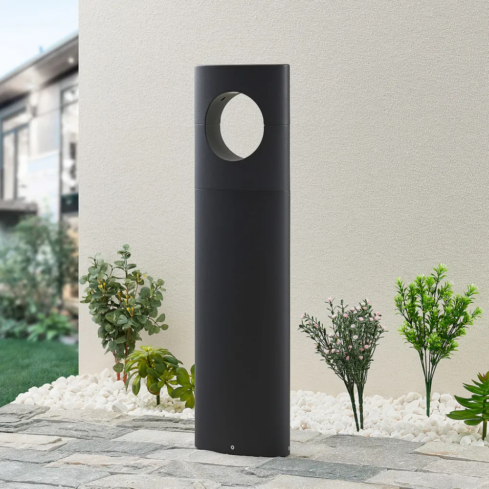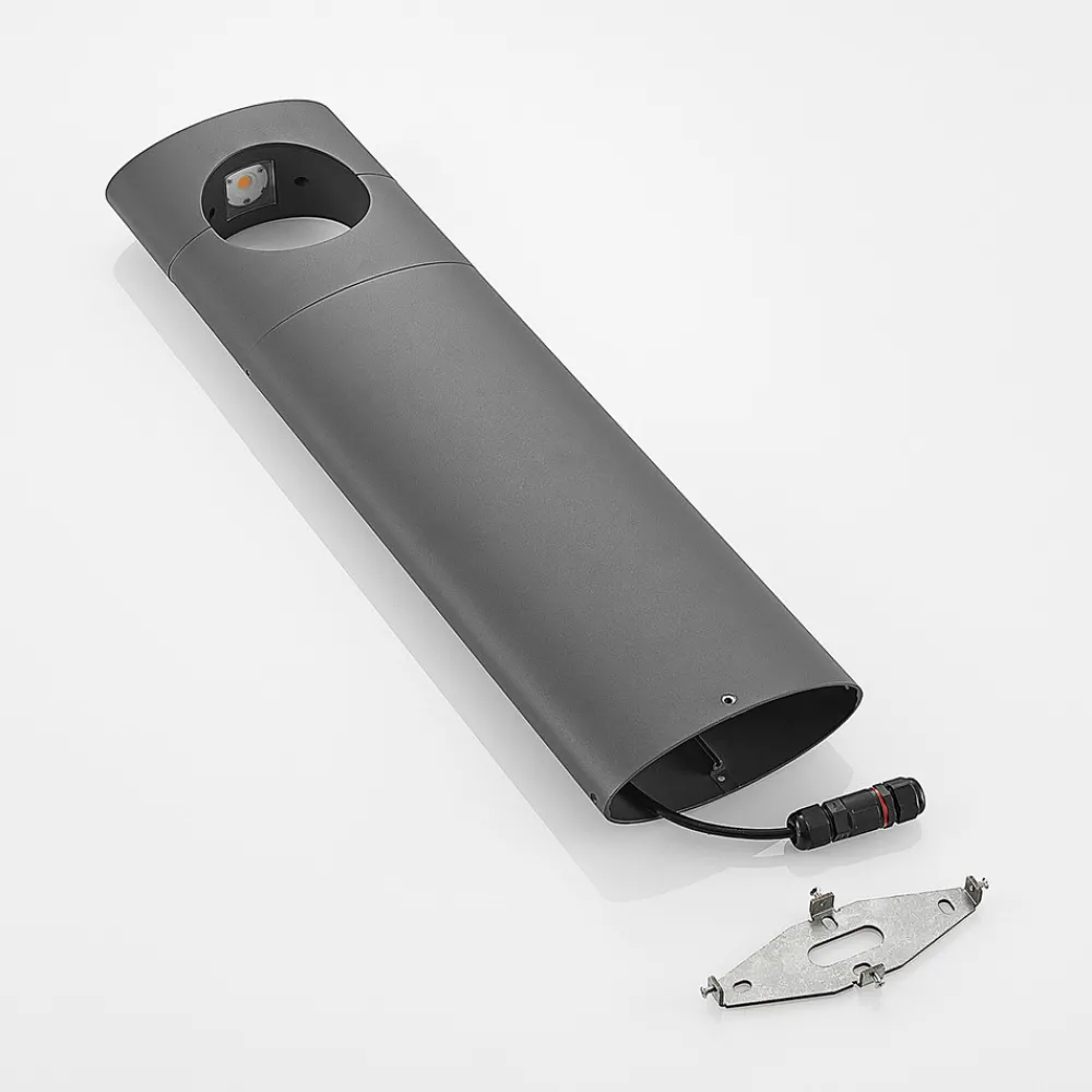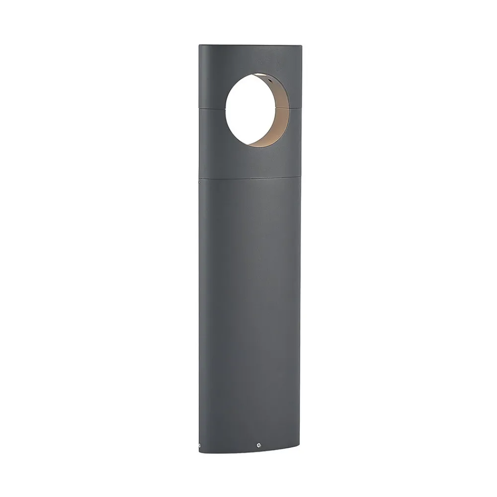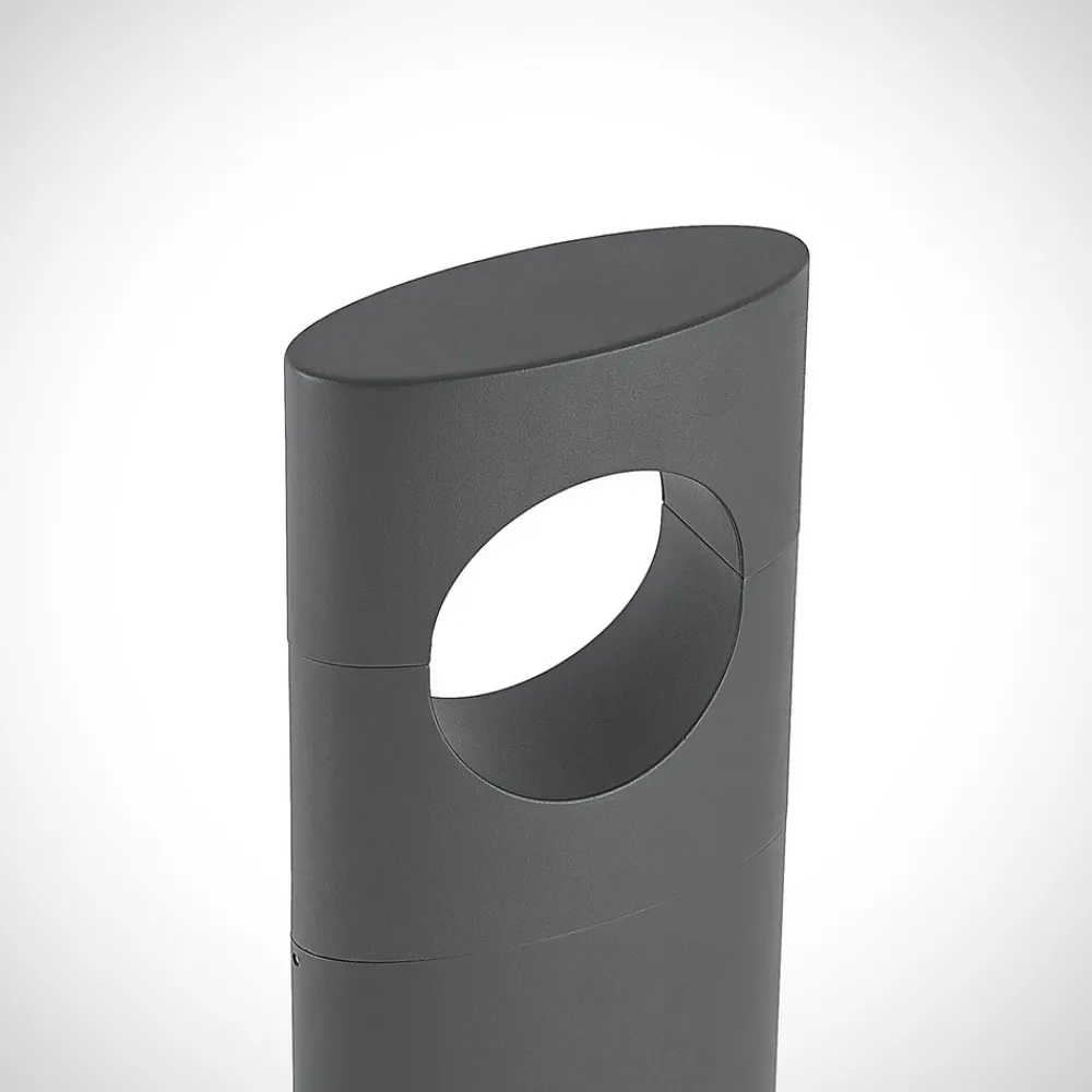 Mørkegrå LED-gatelampe Forama i sofistikert design Dette belysningsobjektet gjør et slående inntrykk ved første øyekast. LED-gatelampen Forama reiser seg opp fra bakken i en oval form og har en sirkulær åpning i den øvre enden, med LED-lampene innebygd i den indre kanten. Rammen er hovedsakelig laget av støpt aluminium, noe som gjør lampen robust og stabil. Takket være den gode kapslingsgraden er Forama godt beskyttet mot vær og vind og er derfor ideell for utendørs bruk.